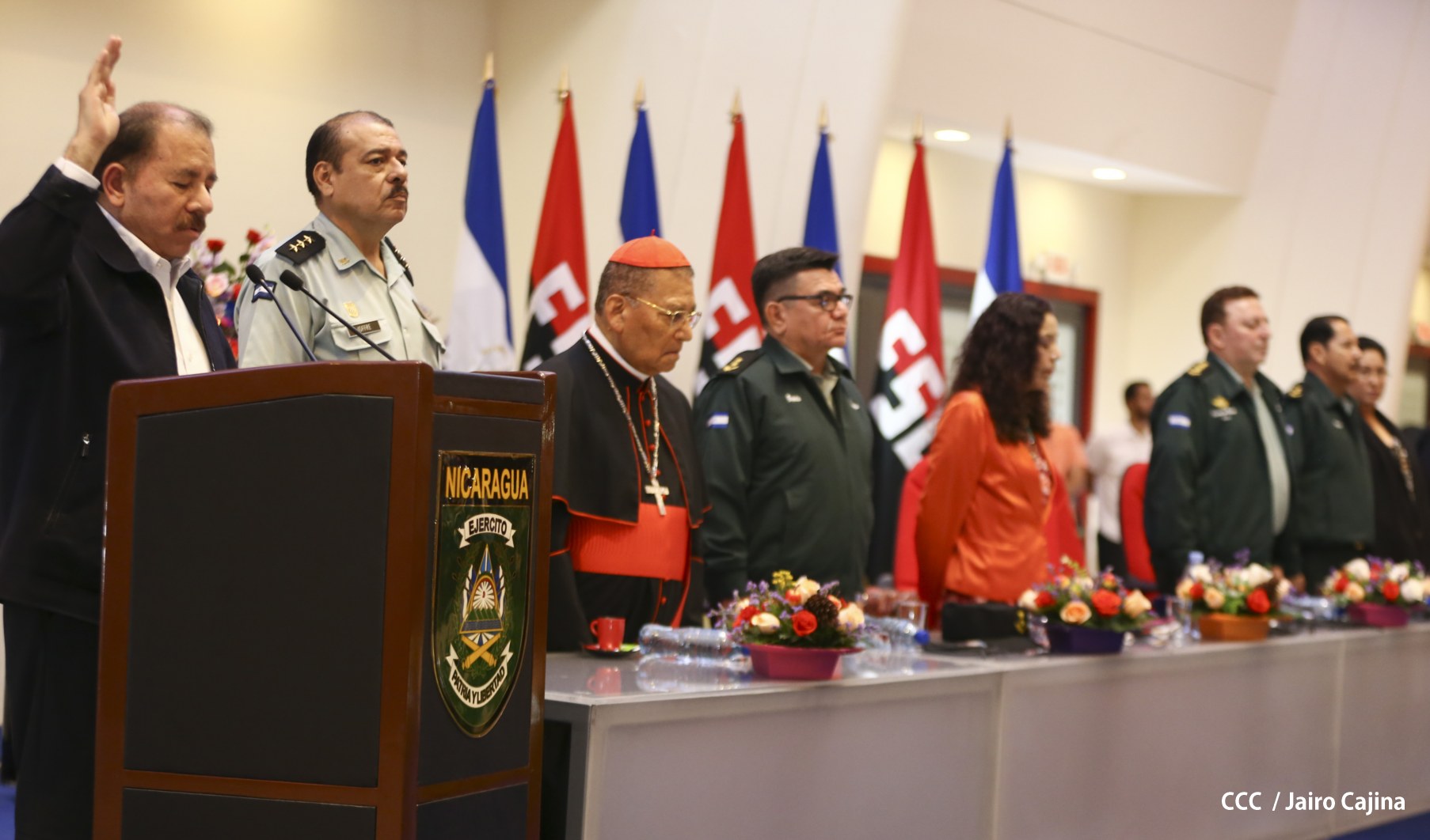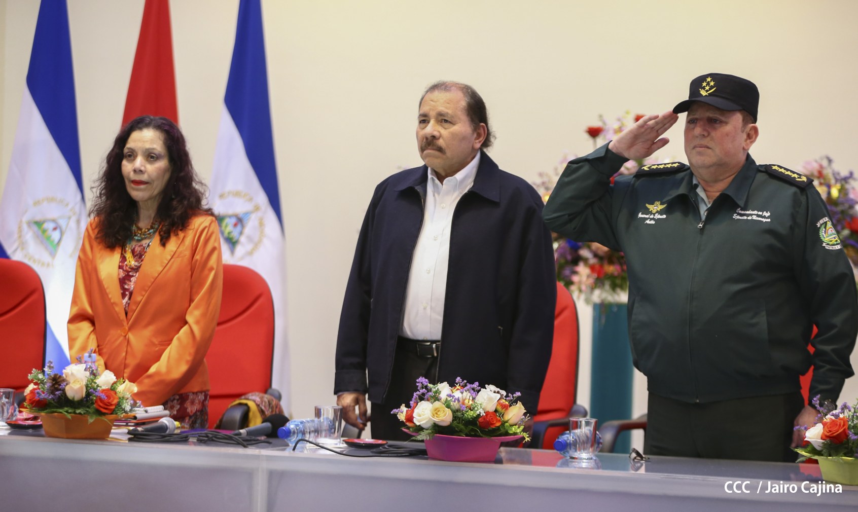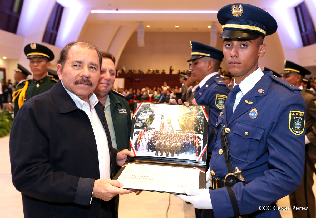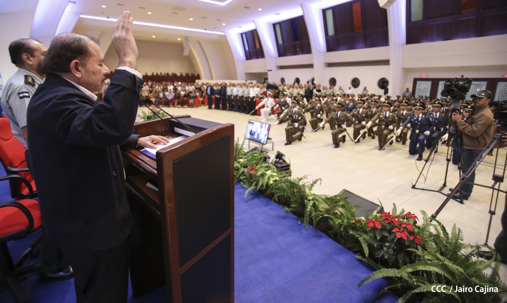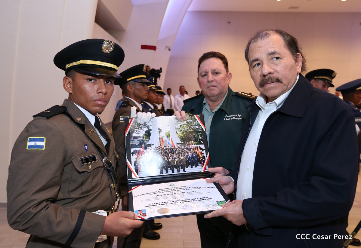 El Presidente de la República, Comandante Daniel Ortega Saavedra, y la Coordinadora del Consejo de Comunicación y Ciudadanía, Compañera Rosario Murillo, presidieron este lunes la XXI Graduación del Curso Regular de Damas y Caballeros Cadetes del Ejército de Nicaragua “Héroe Nacional Rubén Darío”.