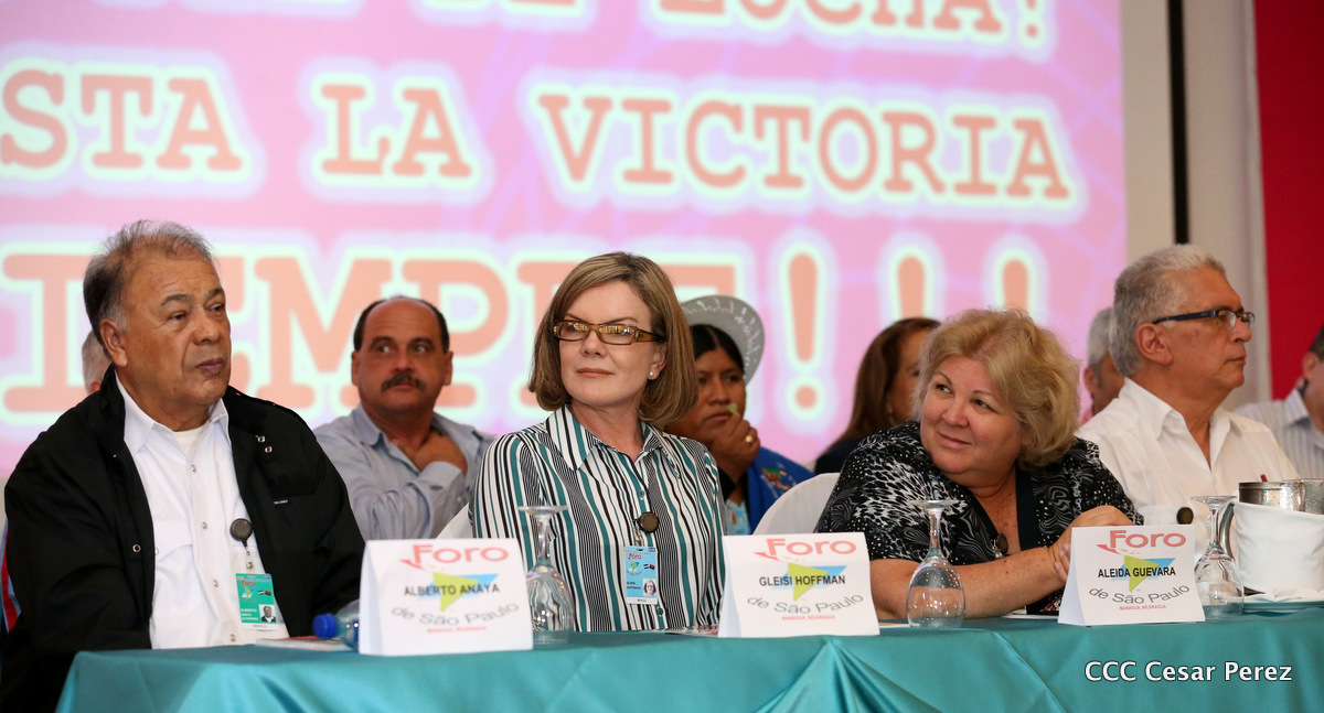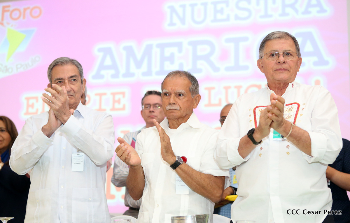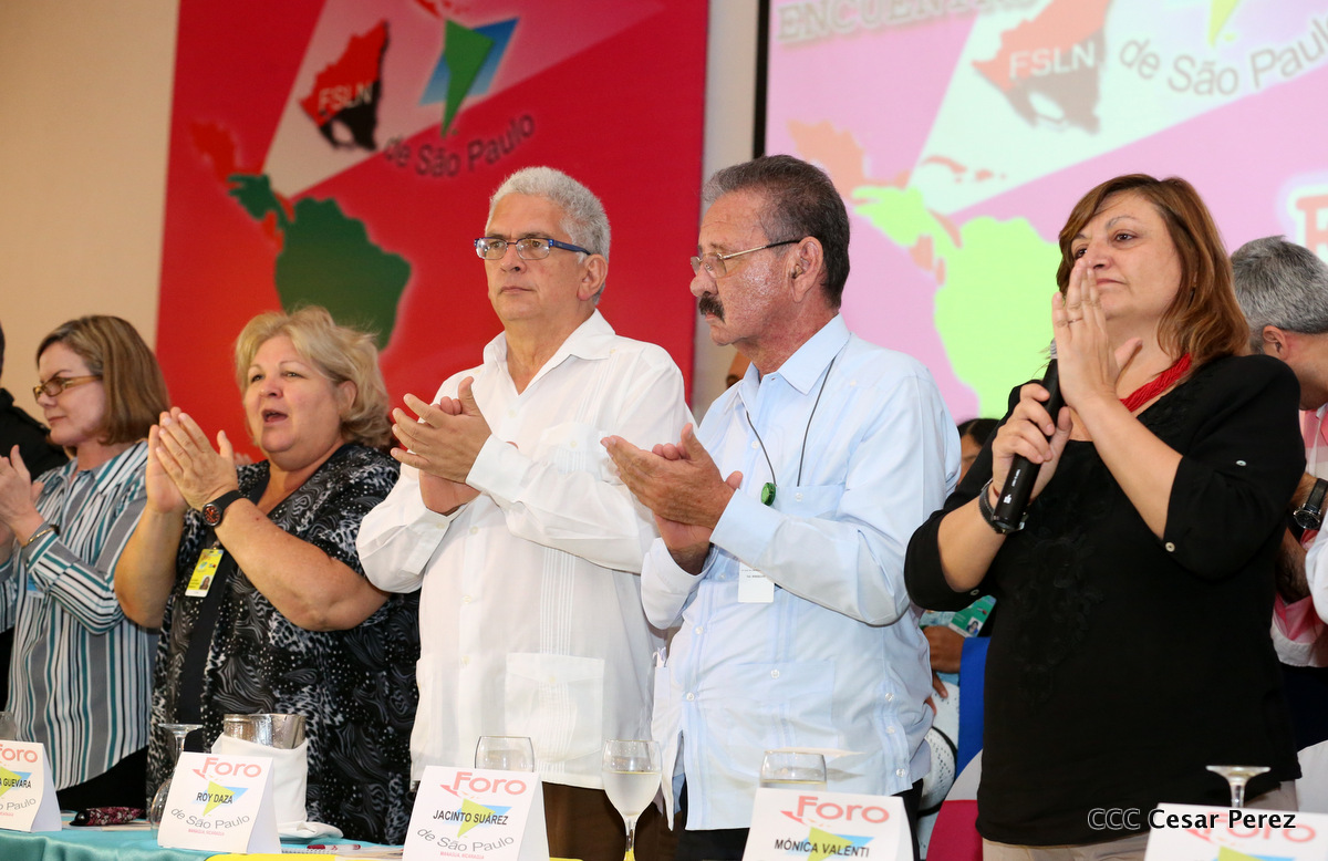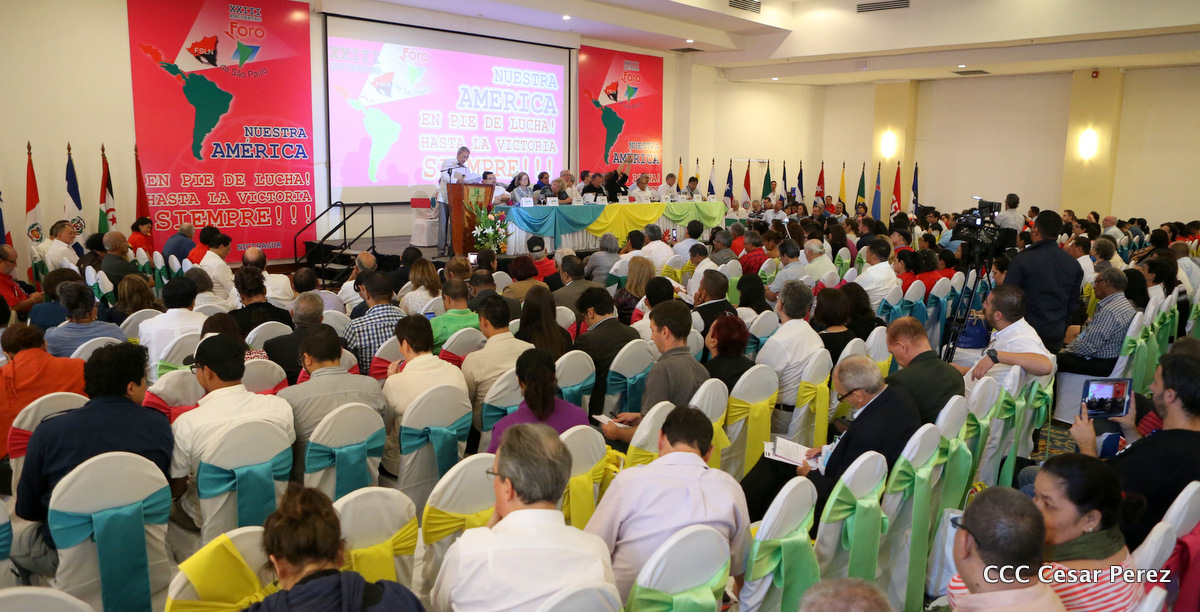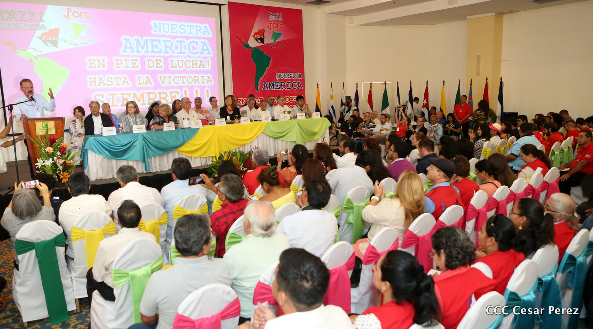 Representantes de partidos políticos y movimientos sociales de 22 países latinoamericanos, participan en el XXIII encuentro del Foro de Sao Paulo, que sesiona en Managua, en saludo al 38 aniversario del triunfo de la Revolución Popular Sandinista.