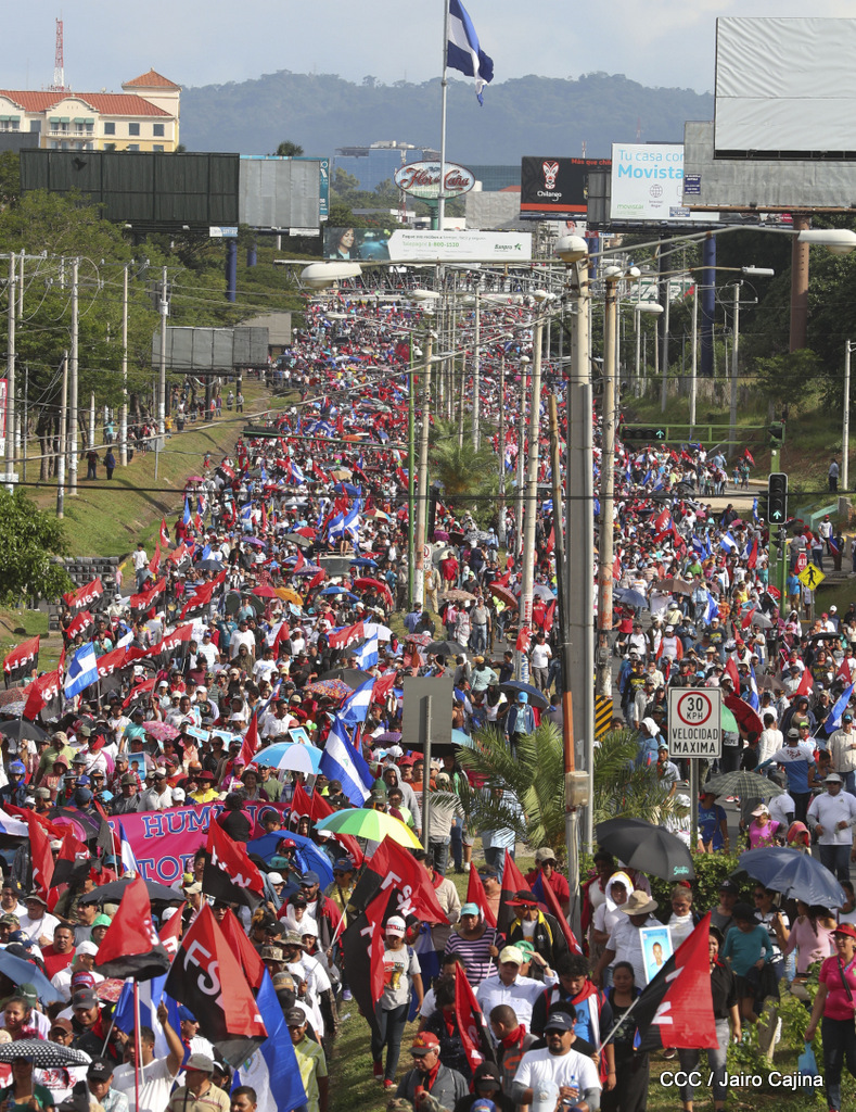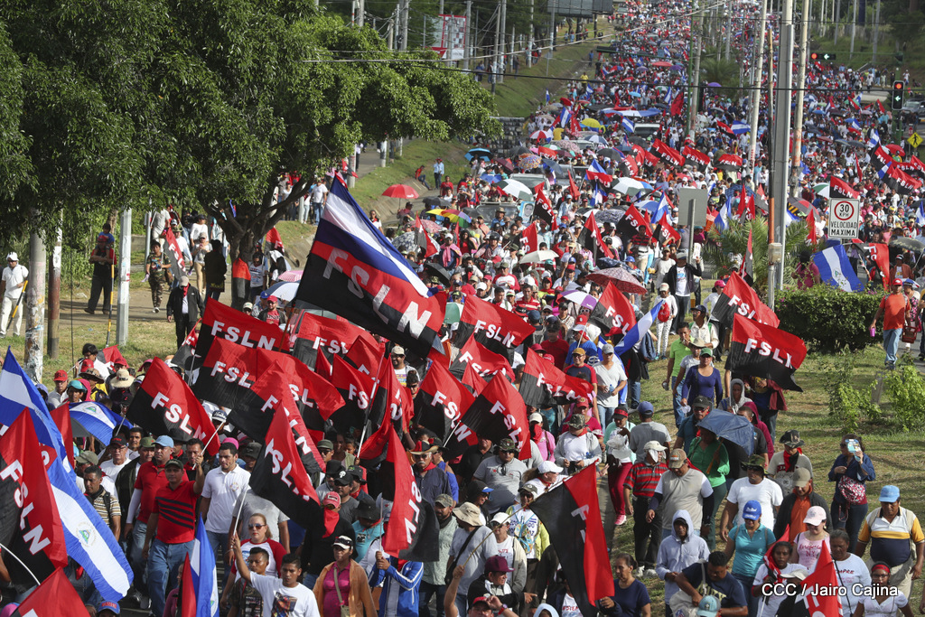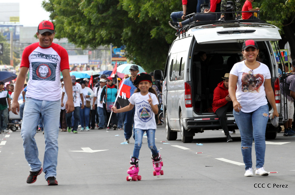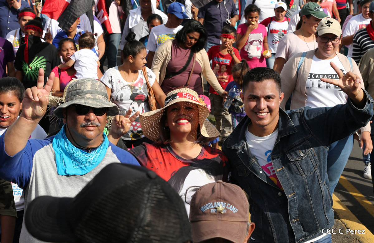 Desde la rotonda Jean Paul Genie cientos de miles de nicaragüenses caminaron hasta llegar a la Avenida de Bolívar a Chávez, en respaldo al Gobierno del Comandante Daniel Ortega y la Compañera Rosario Murillo y en solidaridad con quienes perdieron a un amigo, a un familiar o un compañero de trabajo. Miles recorrieron las principales arterias de la ciudad pidiendo justicia y reparación para las víctimas del terrorismo.