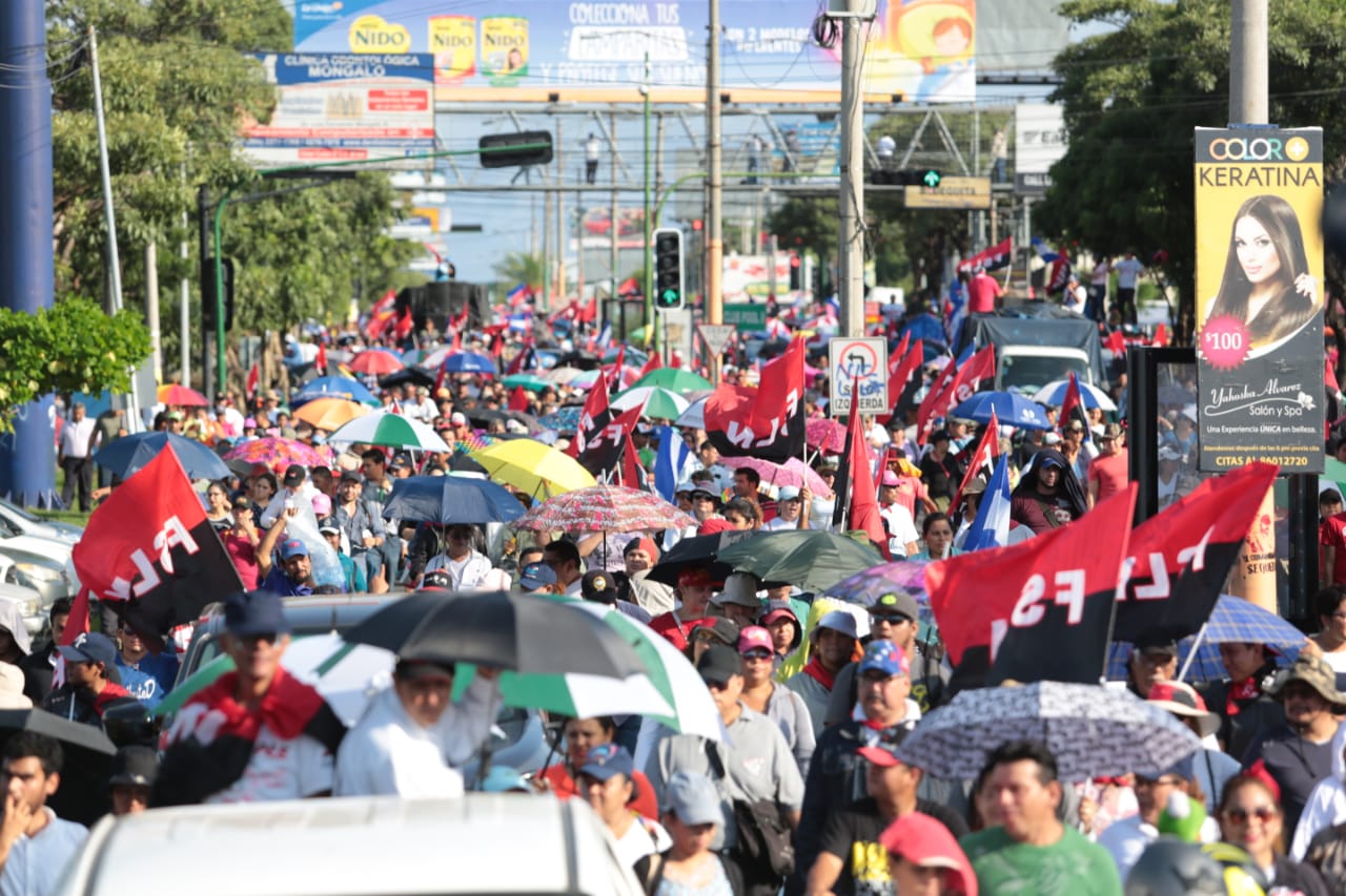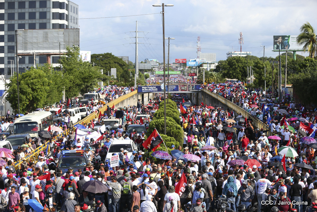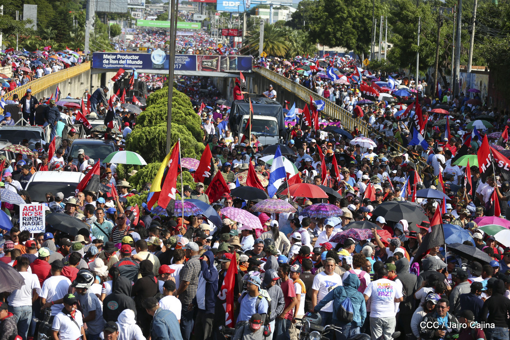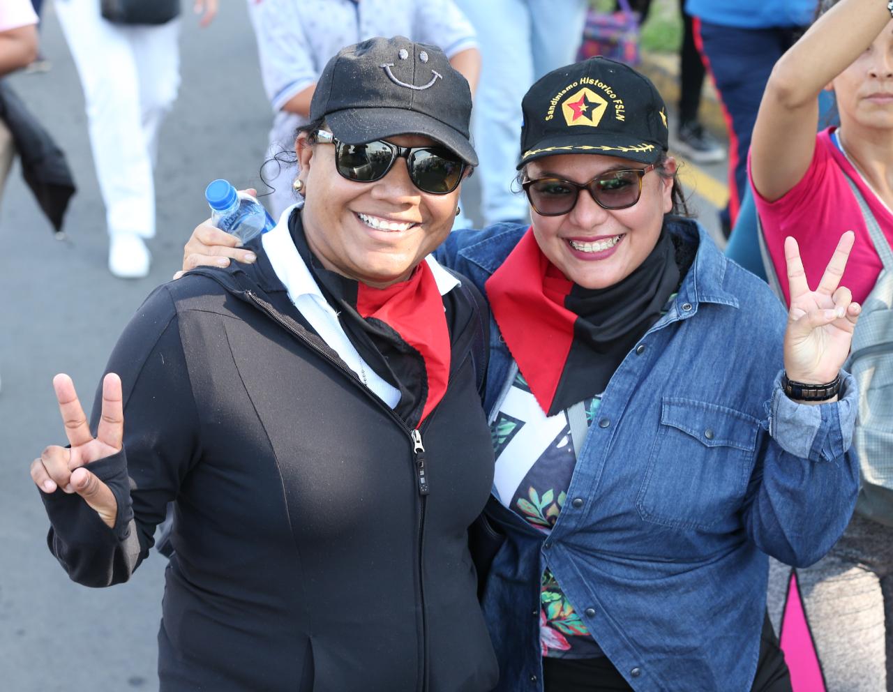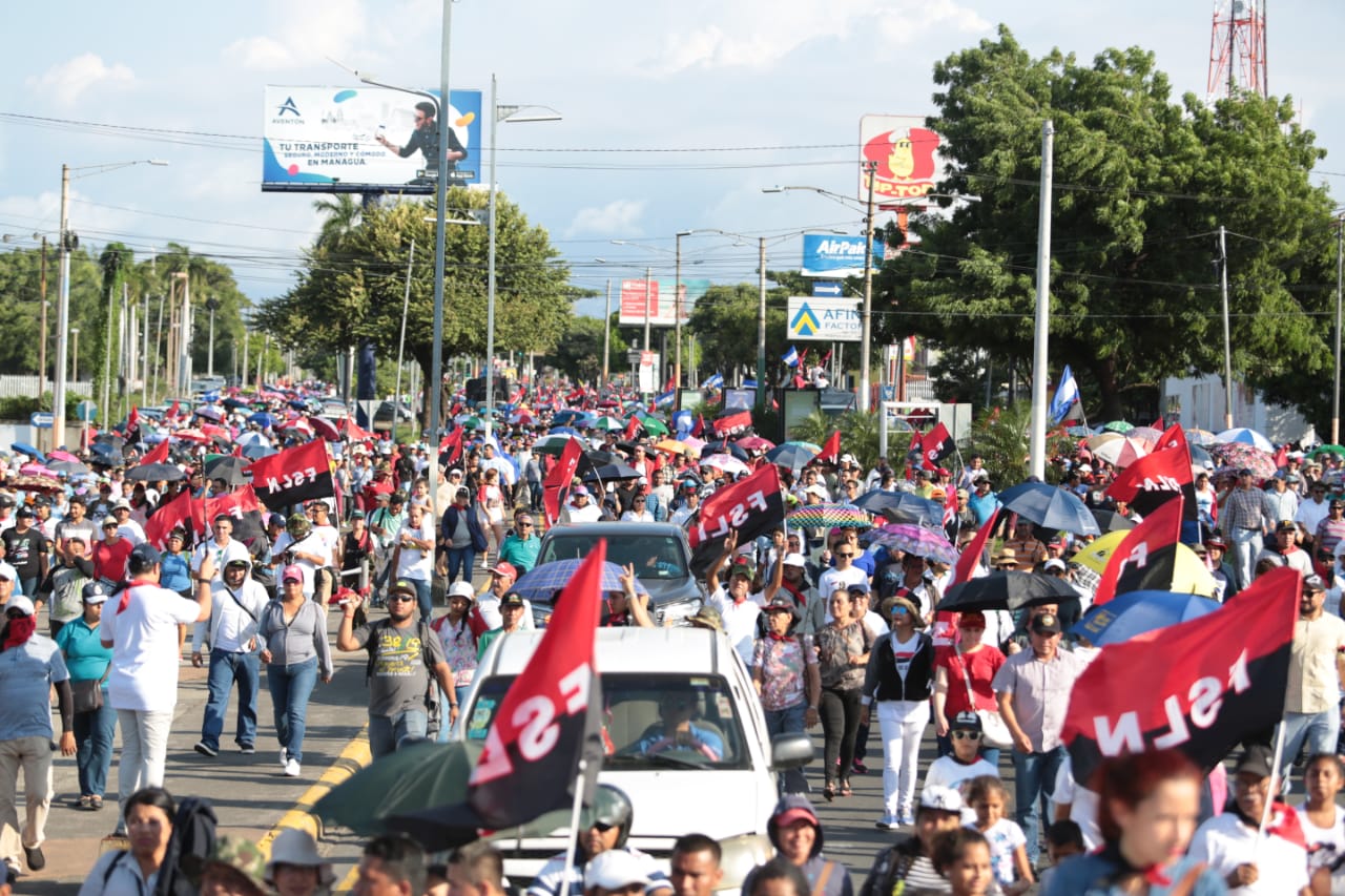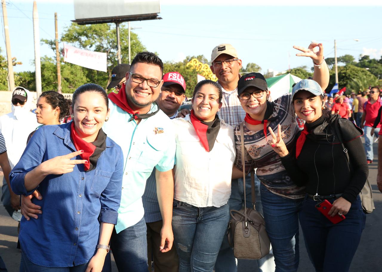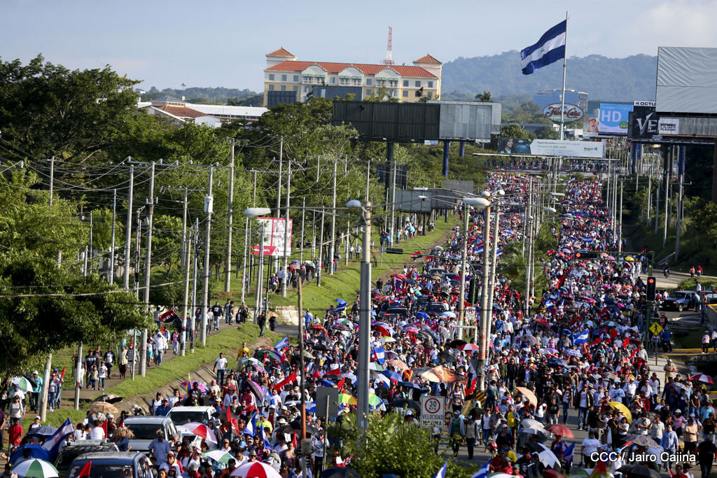 Miles de nicaragüenses marcharon este miércoles por la tarde desde la rotonda Jean Paul Genie hasta la Avenida de Bolívar y Chávez, donde fueron recibidos por nueve alcaldes de Managua, encabezados por la compañera Guiomar Irías, presidente ejecutiva de INIFOM, para ratificar su compromiso por la paz, la justicia y el resurgir de la Nación.