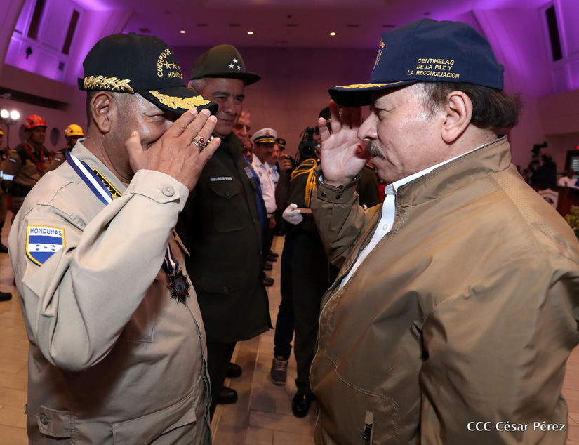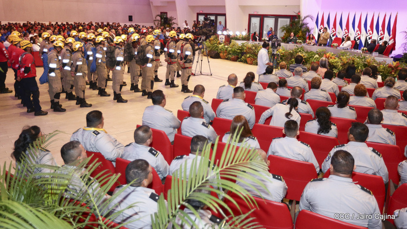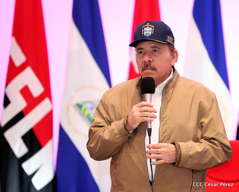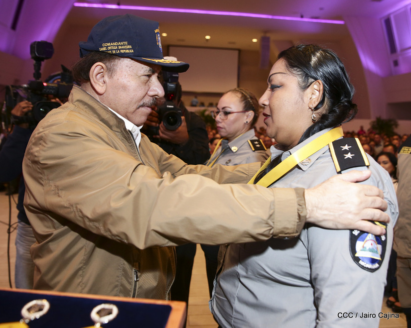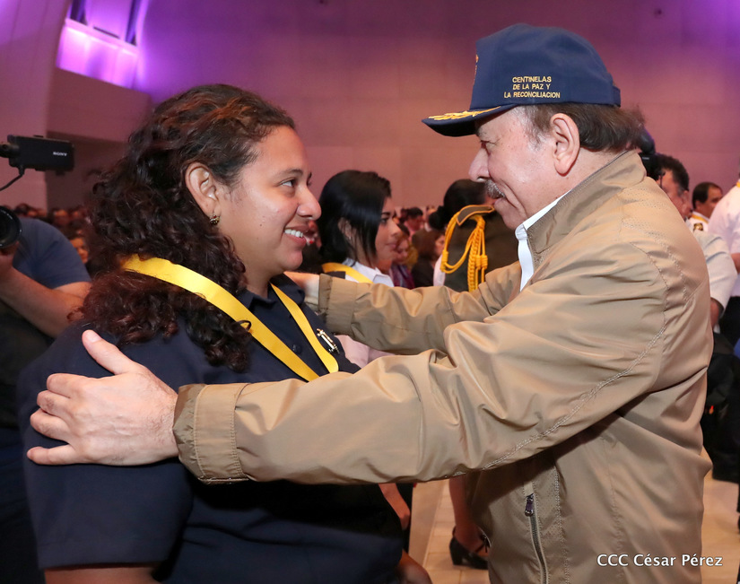 El presidente de la República, comandante Daniel Ortega y la vicepresidenta compañera Rosario Murillo, presiden el acto de 40 aniversario del Ministerio de Gobernación, junto a la compañera ministra María Amelia Coronel y compañera Rosa Adelina Barahona, ministra de Defensa.