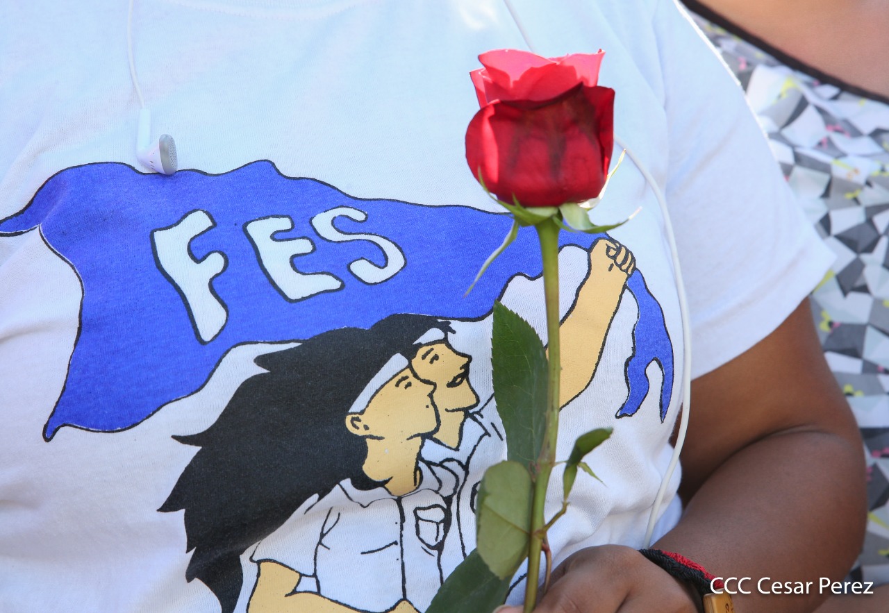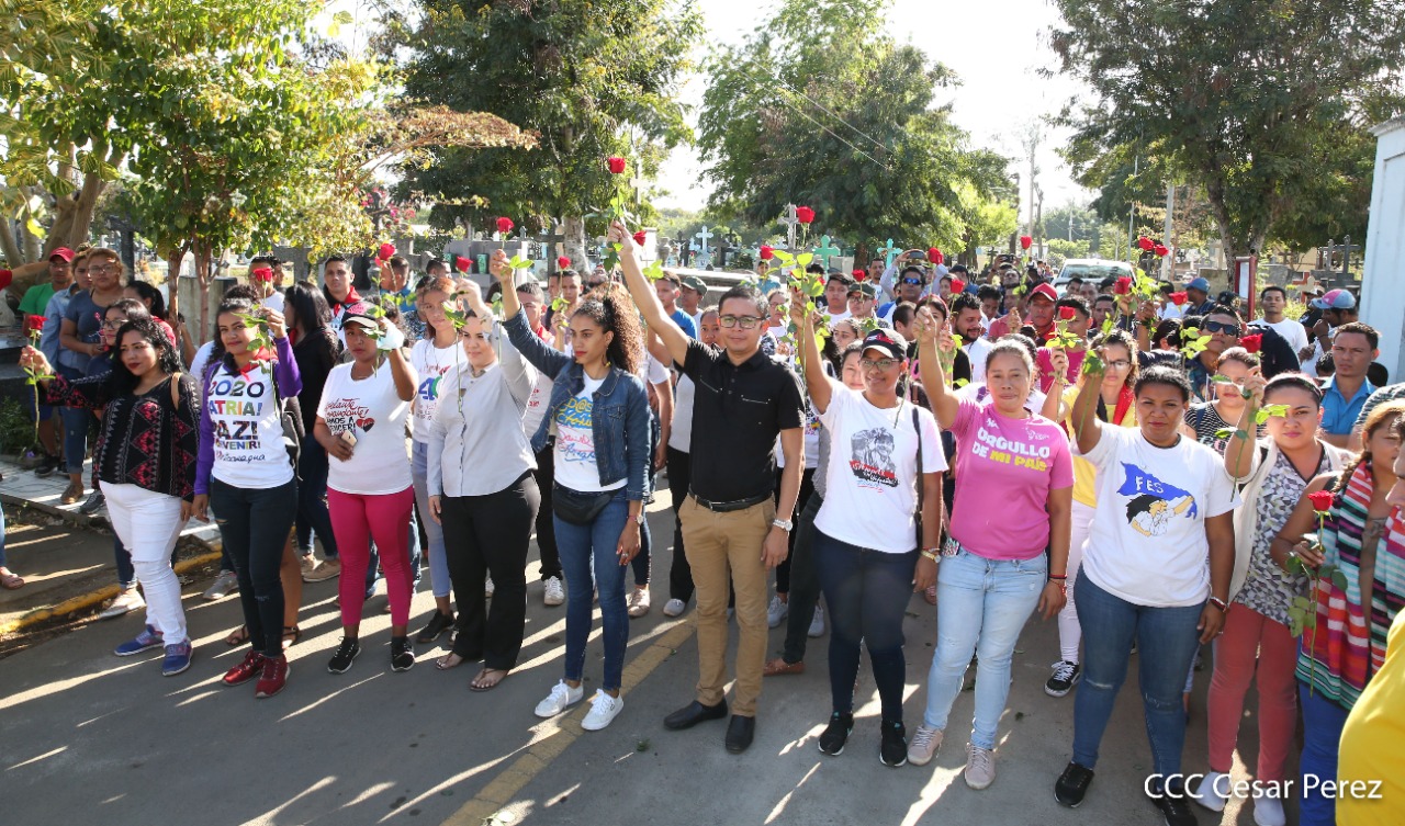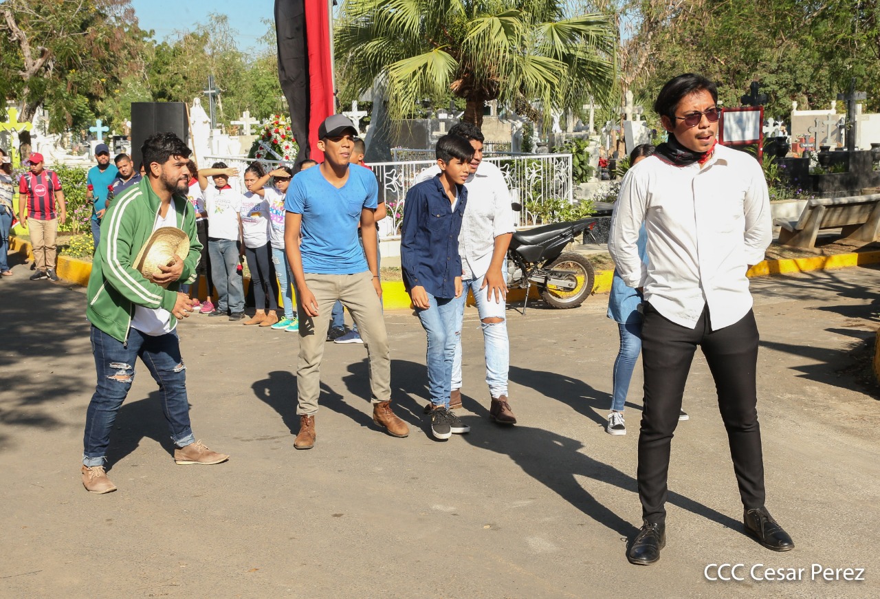 Luego miembros de la Juventud Sandinista 19 de Julio (JS19J) se adentraron cementerio general de Managua donde se encuentra la tumba de Camilo Ortega con ofrendas en mano y recitando poesía, testimonio de la hazaña heroica.
