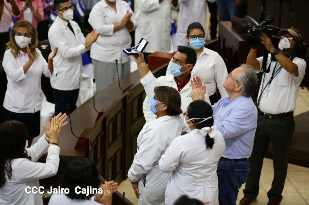 La Asamblea Nacional reconoce la ardua labor heroica que realiza el gremio de las y los trabajadores de la salud en el frente de la lucha contra la pandemia decretada del covid-19 y todas las enfermedades respondiendo con dedicación, esfuerzo, atención humanizada, cariño, compromiso y labor patriótica al cuido, recuperación y bienestar de todo el pueblo nicaragüense. Este reconocimiento fue entregado por la Junta Directiva y diputados en el marco del Día Nacional de las y los Trabajadores de la Salud, este 8 de agosto.
