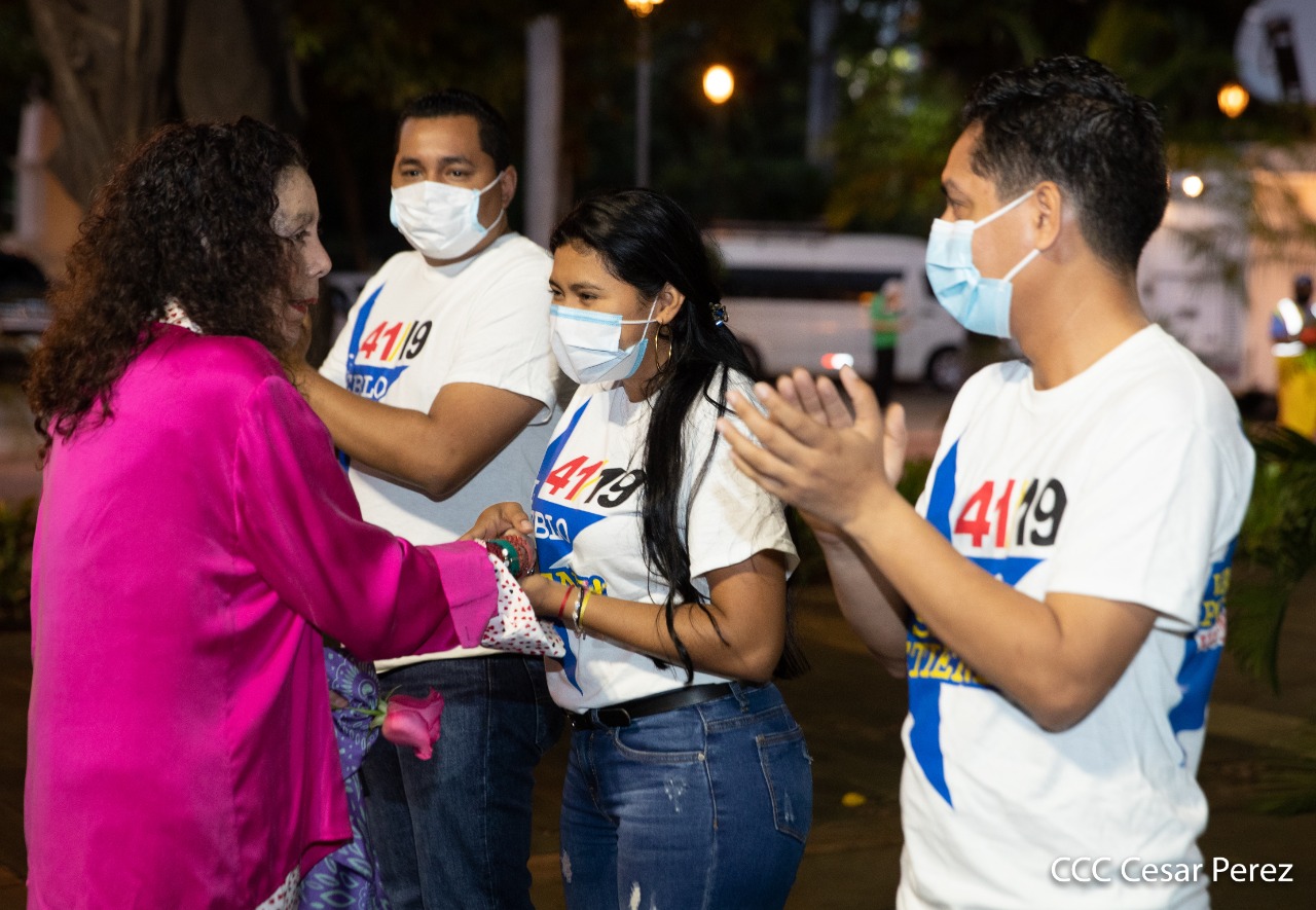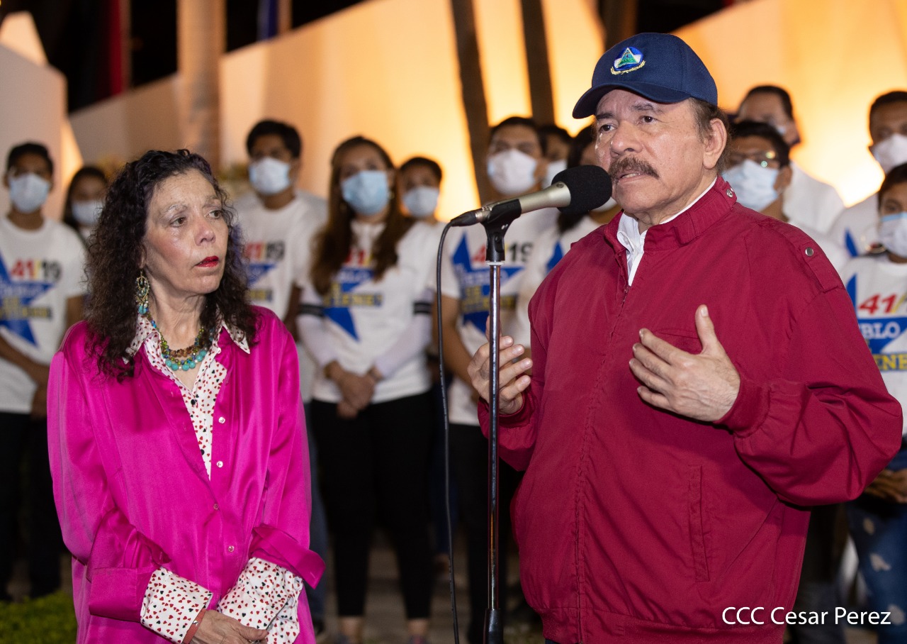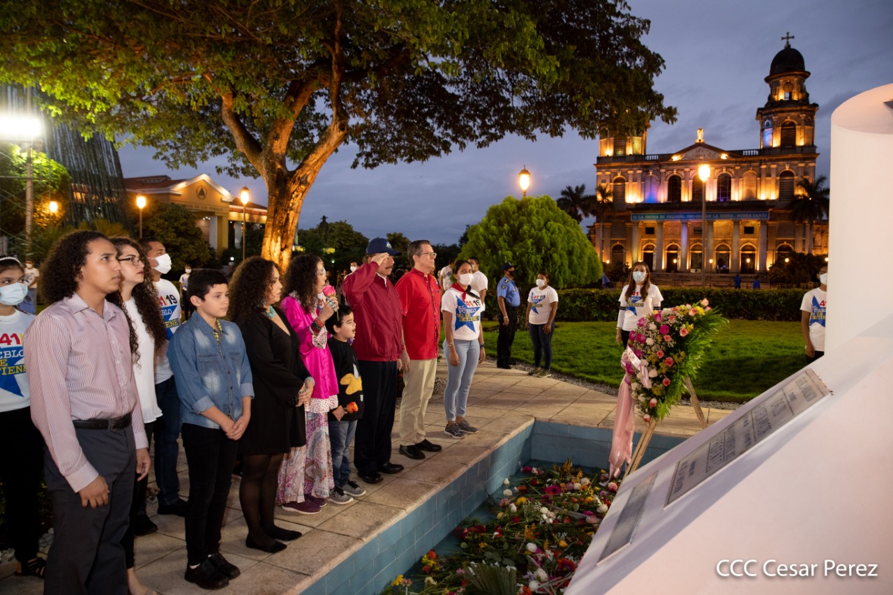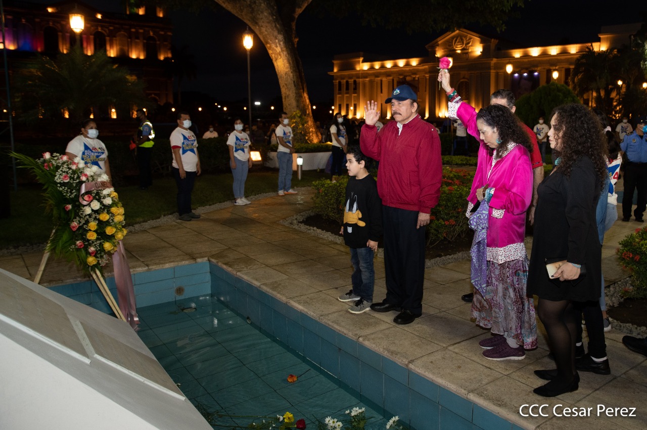 El Presidente de Nicaragua, Comandante Daniel Ortega y la compañera Rosario Murillo presiden el acto de conmemoración del 44 aniversario del paso a la inmortalidad del Comandante Carlos Fonseca Amador, desde el mausoleo en la plaza de la Revolución en Managua.