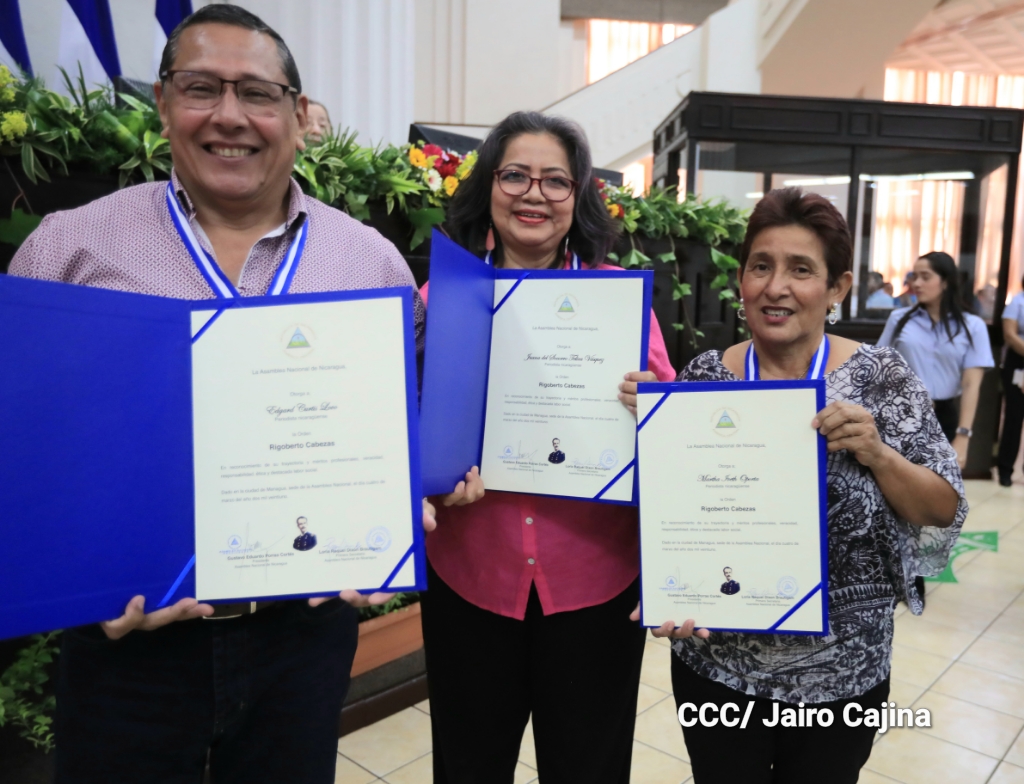 La Asamblea Nacional en sesión especial otorgó la Orden Rigoberto Cabezas a 19 periodistas en el marco de la conmemoración del Día Nacional del Periodista. Los periodistas que recibieron la Orden son: Arlen Hernández (Tu Nueva RadioYa), Edgard Curtis (Canal 2), Nelson Hurtado (Canal 4), Edwin Sánchez (El 19 Digital), Oliver Bodán (Carta Bodán), Martha Rosales (Divulgación INSS), José Miguel Fonseca (Canal 4), Juanita Telica (Divulgación Minsa), Martha Oporta (Cofundadora de UPN) e Irma Franco (Divulgación Ministerio de Defensa).