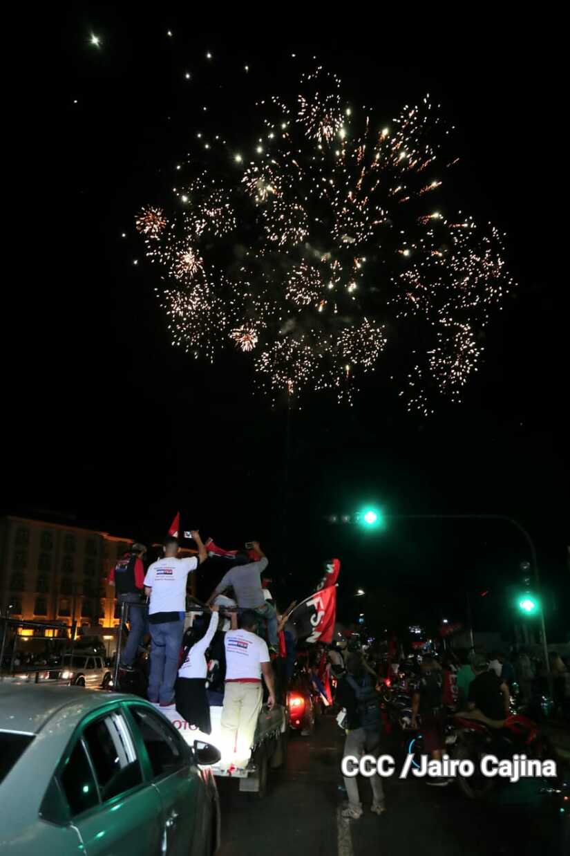Miles de pobladores de la capital celebraron la madrugada de este lunes 8 de noviembre, la victoria del FSLN en las Elecciones Soberanas 2021.
