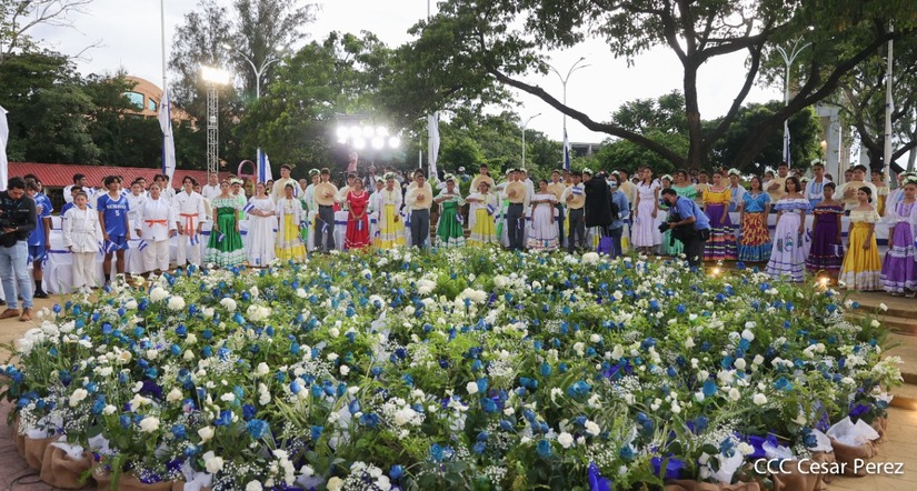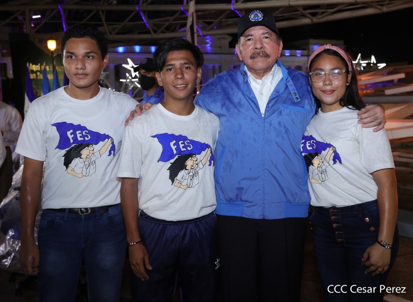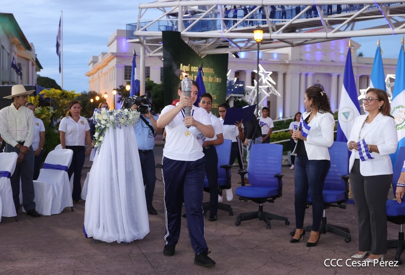 El Presidente de la República Comandante Daniel Ortega Saavedra recibió la antorcha de la paz y la libertad de manos de la mejor estudiante de Managua Esmeralda Carolina Méndez Cruz del Centro Escolar República de Ecuador. La bandera de Nicaragua era portada por el estudiante José González Flores del Instituto Experimental México y de la Federación de Estudiantes de Secundaria Julieth Jarquín Maltez del colegio Che Guevara de Villa El Carmen.