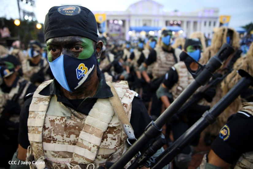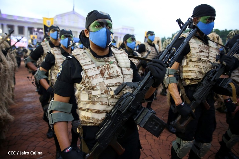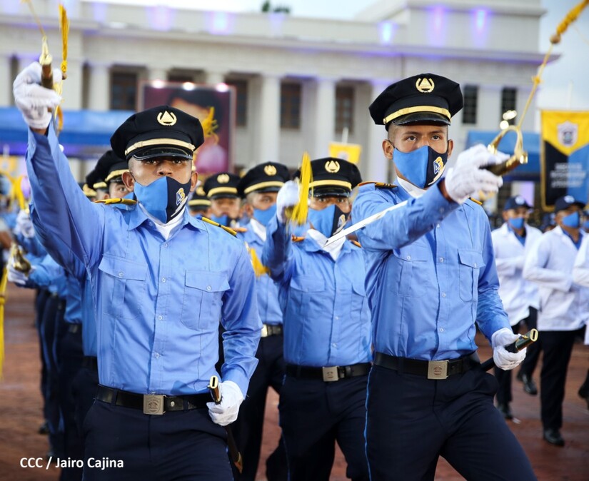 Desde la Plaza de la Revolución, el Presidente de la República, comandante Daniel Ortega Saavedra y la vicepresidenta compañera Rosario Murillo, presiden junto al primer comisionado general Francisco Díaz Director de la Policía Nacional, el acto en conmemoración del 43 aniversario de constitución de la Policía Nacional.