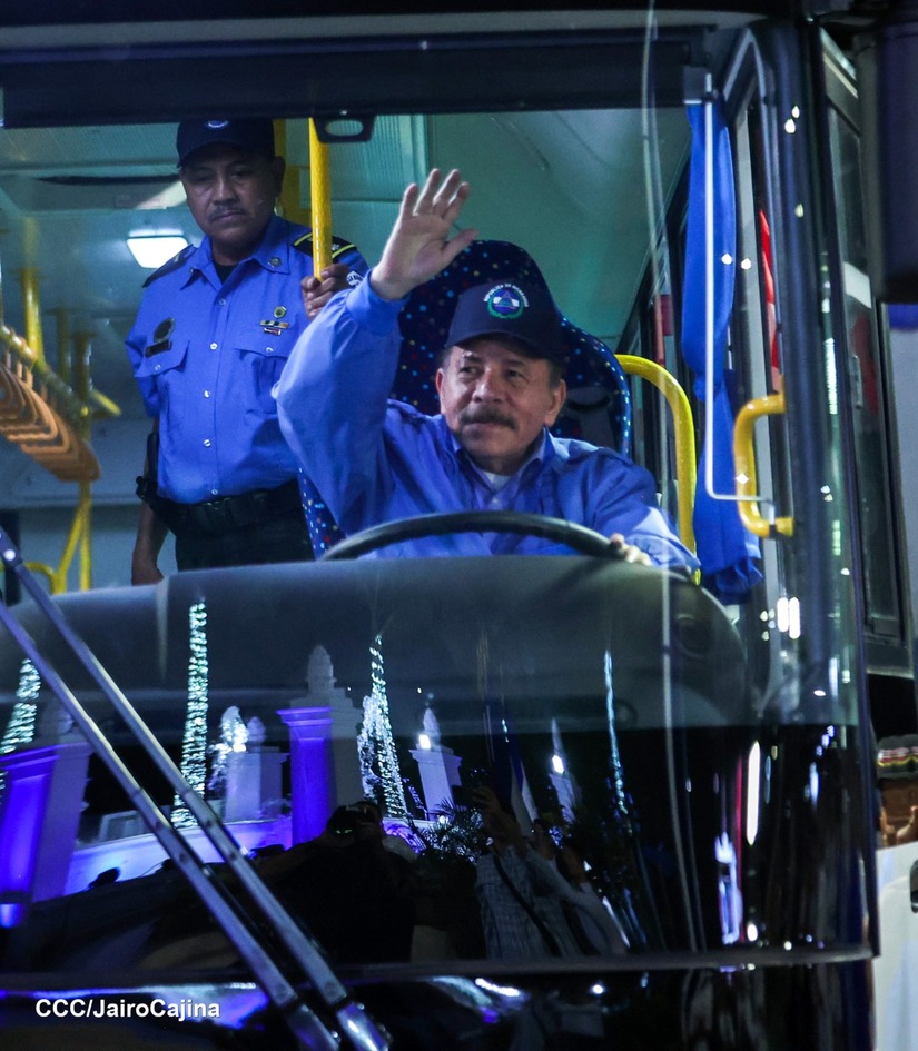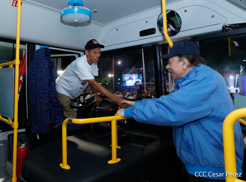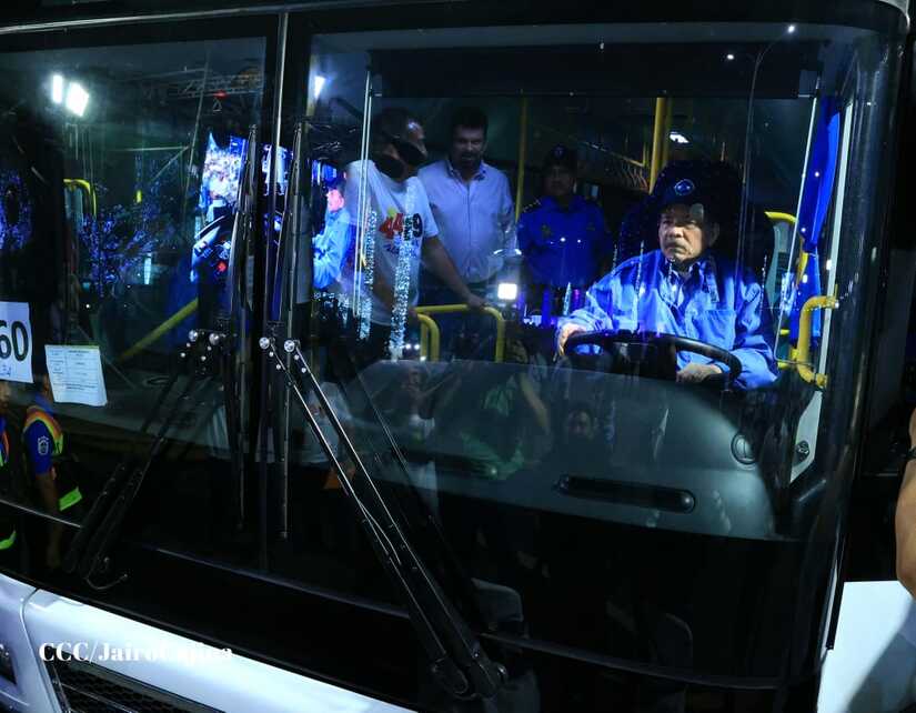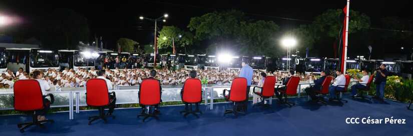 El Presidente de la República, Comandante Daniel Ortega y la Vicepresidenta Compañera Rosario Murillo, presiden el acto en donde se realiza la entrega de los 250 autobuses provenientes de la República Popular China a transportistas de Managua y Ciudad Sandino.