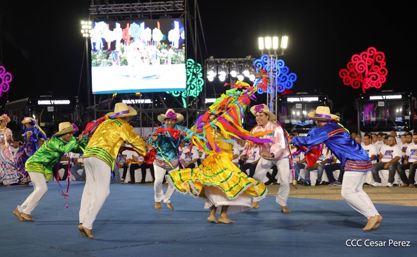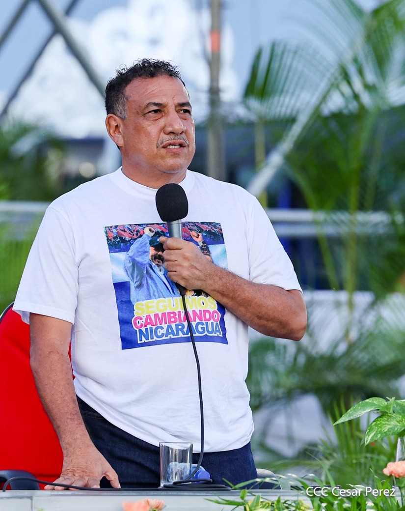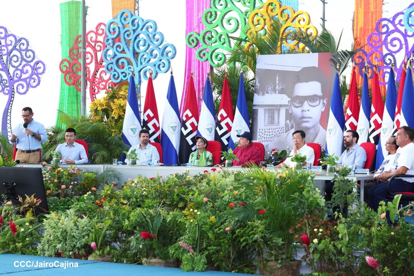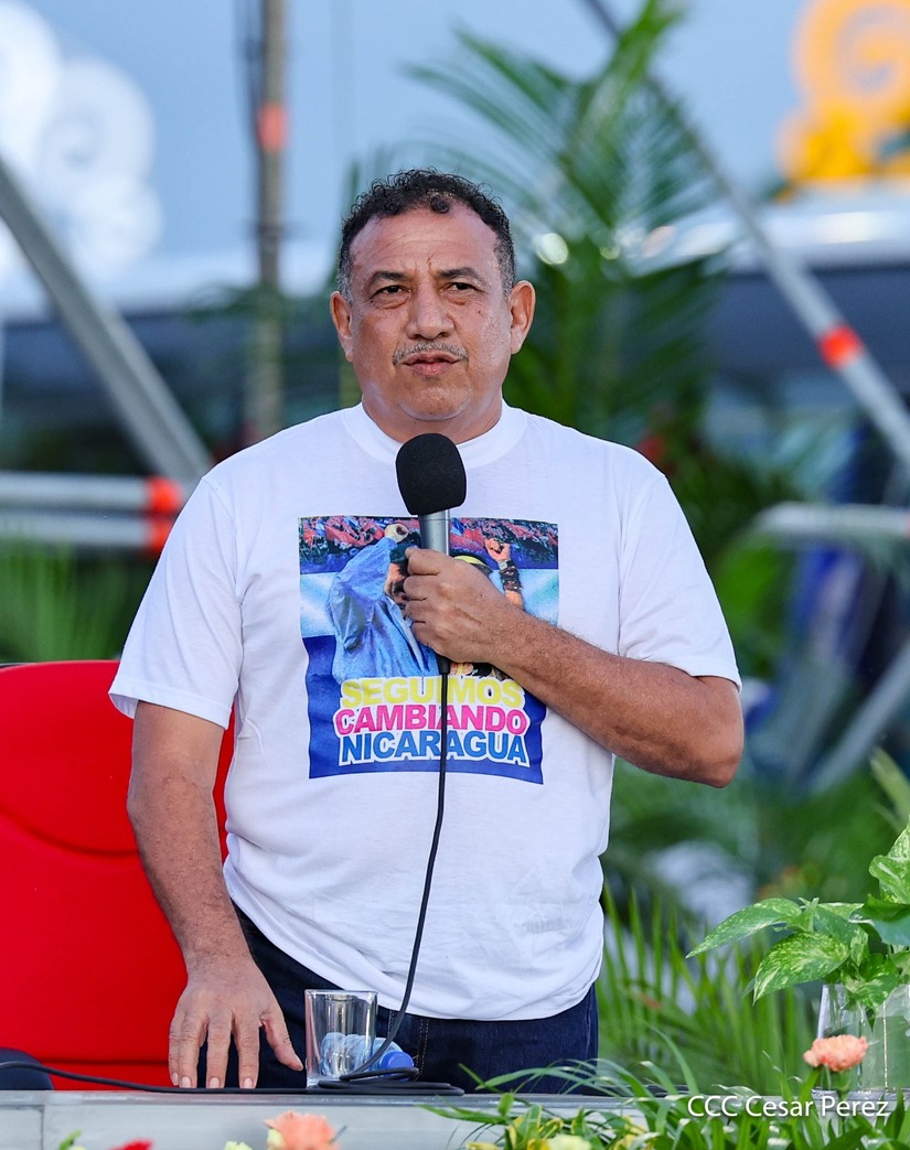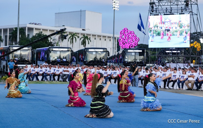 El Presidente de la República, Comandante Daniel Ortega y la Vicepresidenta Compañera Rosario Murillo, presiden el acto de la entrega de 250 autobuses provenientes de la República Popular China a 28 cooperativas de Managua, en saludo al 45 aniversario de la Revolución Popular Sandinista.