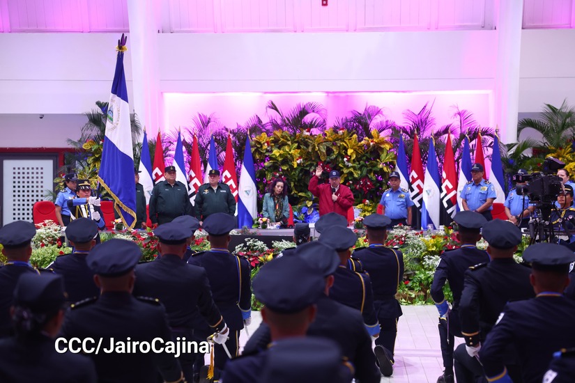 Desde el Centro de Convenciones Olof Palme, se realiza la XXVII Graduación de Cadetes de la Universidad de Ciencias Policiales “Leonel Rugama” de la Policía Nacional. Presiden el acto el Comandante Daniel Ortega Saavedra, Presidente de la República, y la Compañera Rosario Murillo Zambrana, Vicepresidenta de la República.