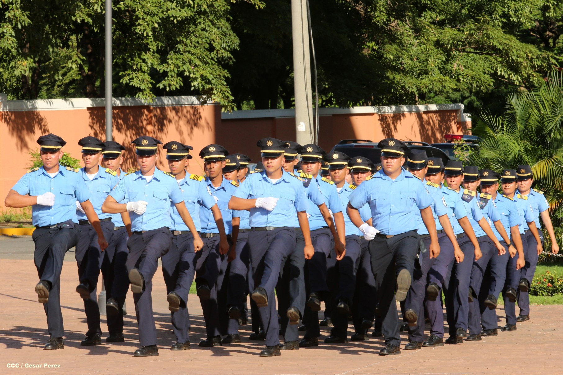 Cadetes de la Policía Nacional practican en la Plaza de la Revolución (Managua) previo al Acto Oficial de Graduación que será presidido por el Comandante Daniel Ortega.