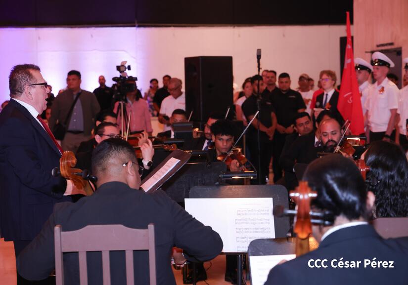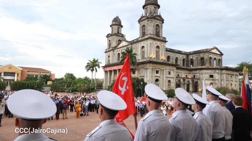 La Plaza de la Revolución en Managua se iluminó del color de la bandera del Ejército Rojo en el acto solemne en honor al 80 aniversario de la Victoria sobre el Fascismo.