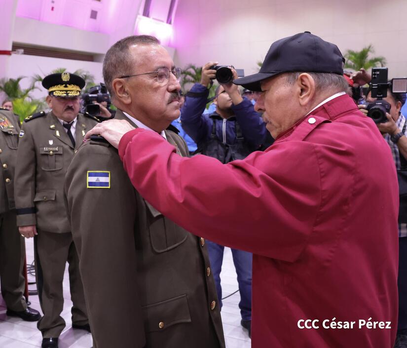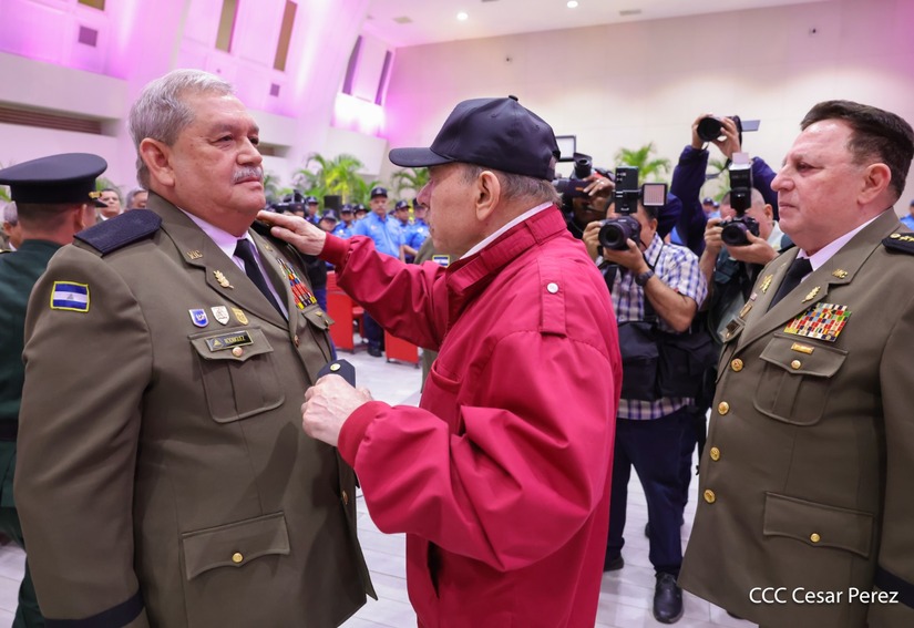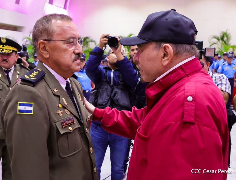 El Copresidente de la República y Jefe Supremo del Ejército de Nicaragua, Comandante Daniel Ortega, junto a la Copresidenta Compañera Rosario Murillo, presiden el solemne acto de ascenso al grado de Coronel General de los Mayores Generales Bayardo Ramón Rodríguez, Jefe del Estado Mayor General, y Marvin Elías Corrales Rodríguez, Inspector General del Ejército de Nicaragua.