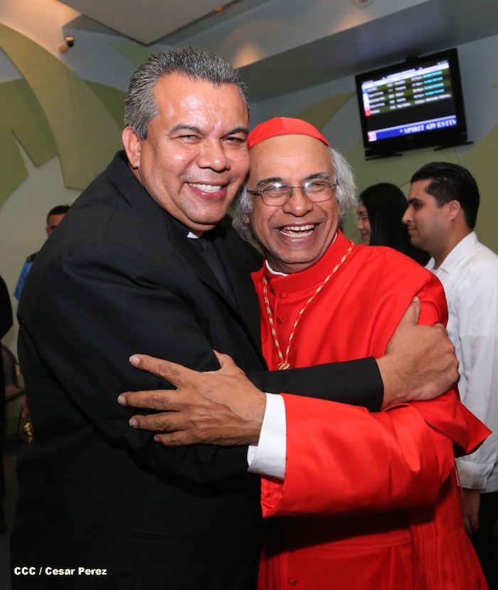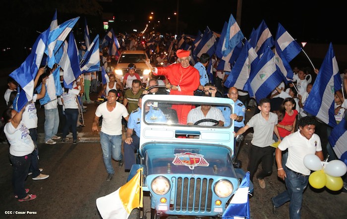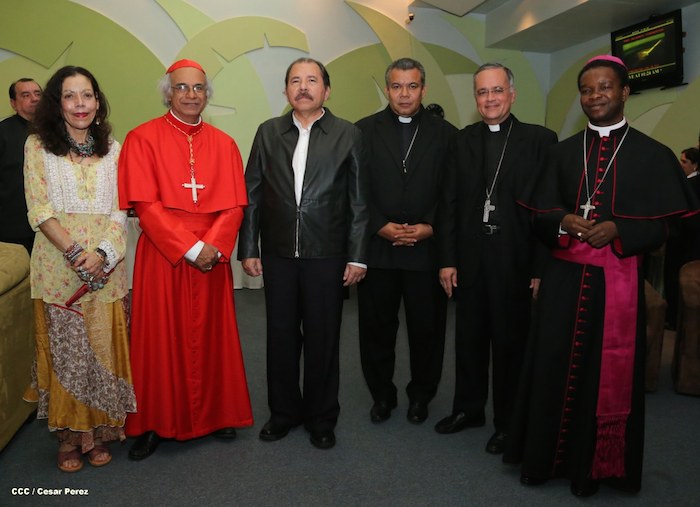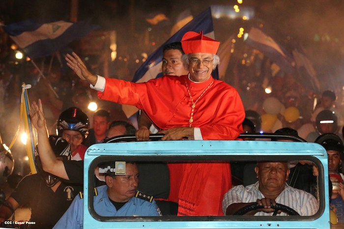 El Presidente de Nicaragua, Comandante Daniel Ortega Saavedra, y la Coordinadora del Consejo de Comunicación y Ciudadanía, Compañera Rosario Murillo, recibieron la noche de este lunes a Su Eminencia Reverendísima Cardenal Leopoldo Brenes, quien regresó de Roma tras su investidura oficial como Príncipe de la Iglesia Católica por parte de Su Santidad el Papa Francisco.