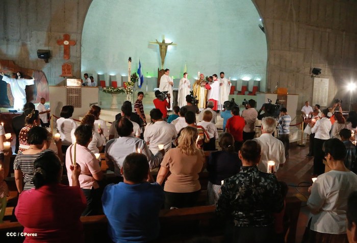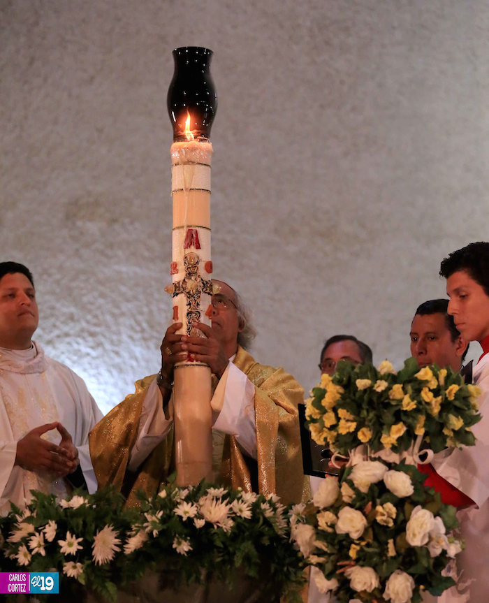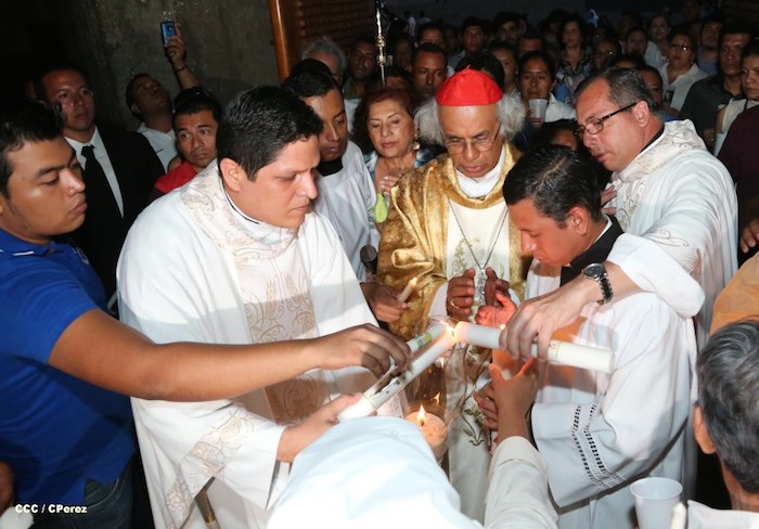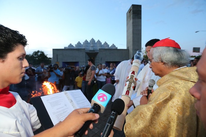 Un bonito y estremecedor mensaje emitió Su Eminencia Reverendísima, Cardenal Leopoldo Brenes, a la feligresía nicaragüense durante la Vigilia de Pascua este sábado santo por la noche. El recién ordenado Cardenal por el Papa Francisco, durante la misa litúrgica, se puso en pie frente a todas las familias católicas y, tomando fuertemente el micrófono, anunció la gran noticia: ¡Cristo ha resucitado!