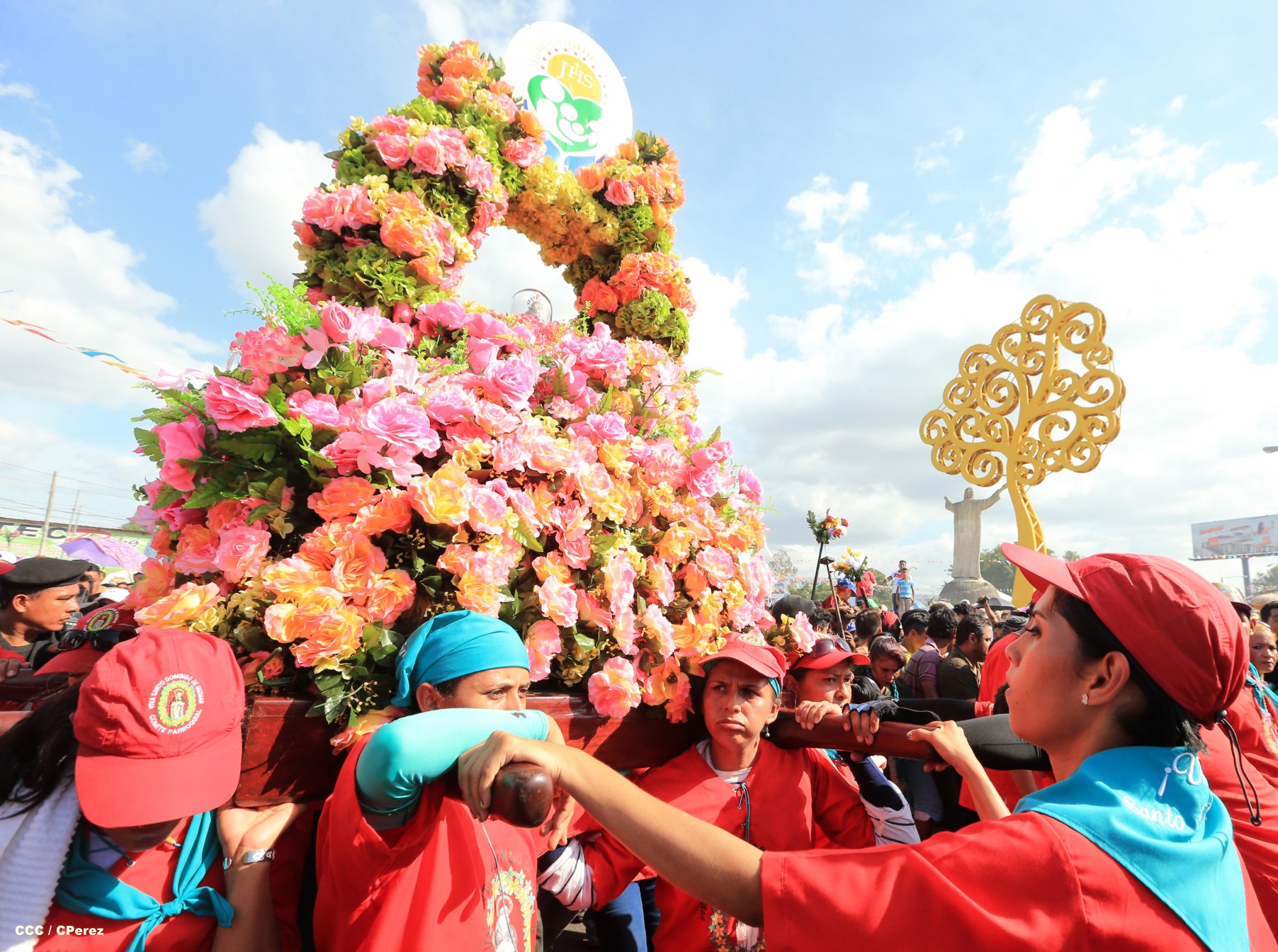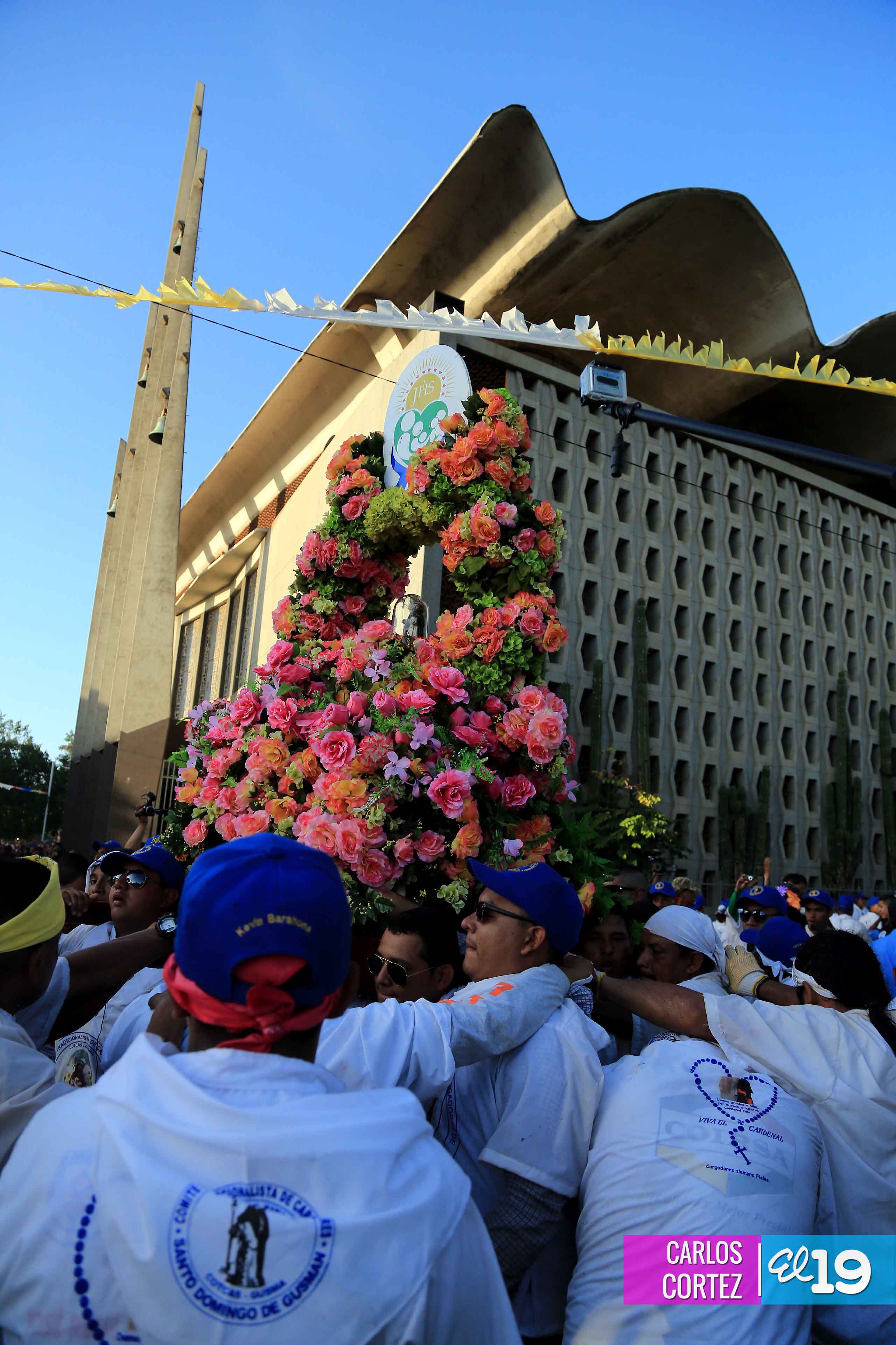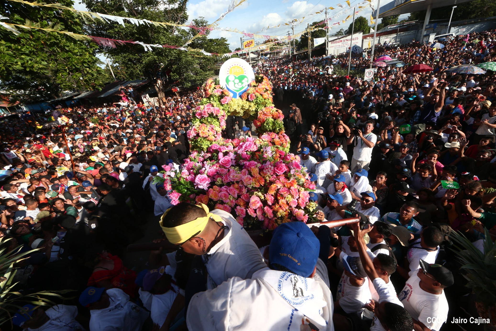 Centenares de miles de nicaragüenses acompañaron por casi 12 horas la llegada de Santo Domingo de Guzmán a Managua, que entre vivas, explosión de cohetes y una algarabía multicolor lo llevaron hasta la Iglesia de su mismo nombre en el sector del barrio 19 de Julio, lugar en que permanecerá los próximos diez días.
