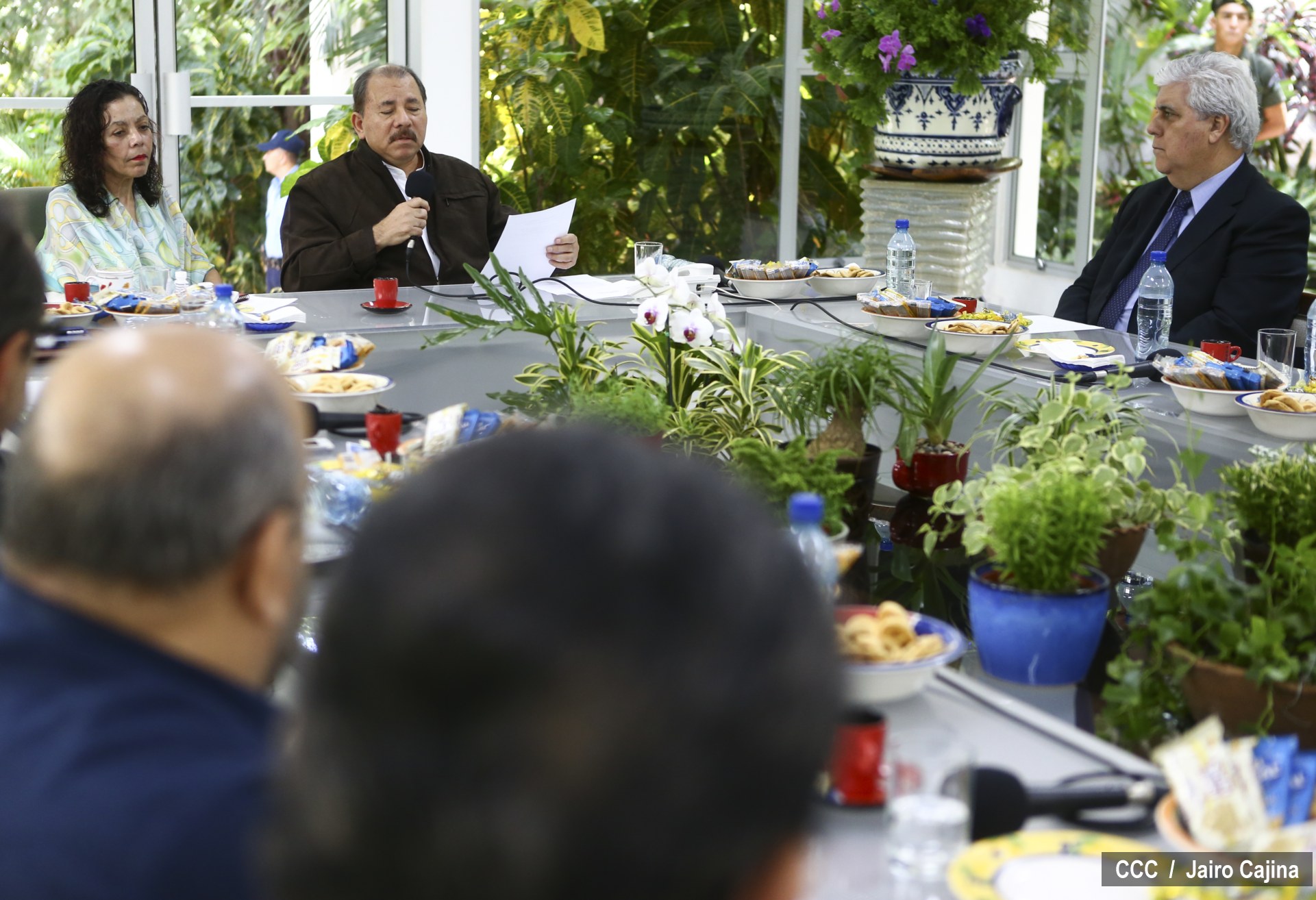 El Presidente de la República, Comandante Daniel Ortega Saavedra, y la Compañera Rosario Murillo, Coordinadora del Consejo de Comunicación y Ciudadanía, sostuvieron una sesión de trabajo con los representantes de empresas brasileñas que a partir del próximo año iniciarán la construcción de la planta de generación hidroeléctrica Tumarín.