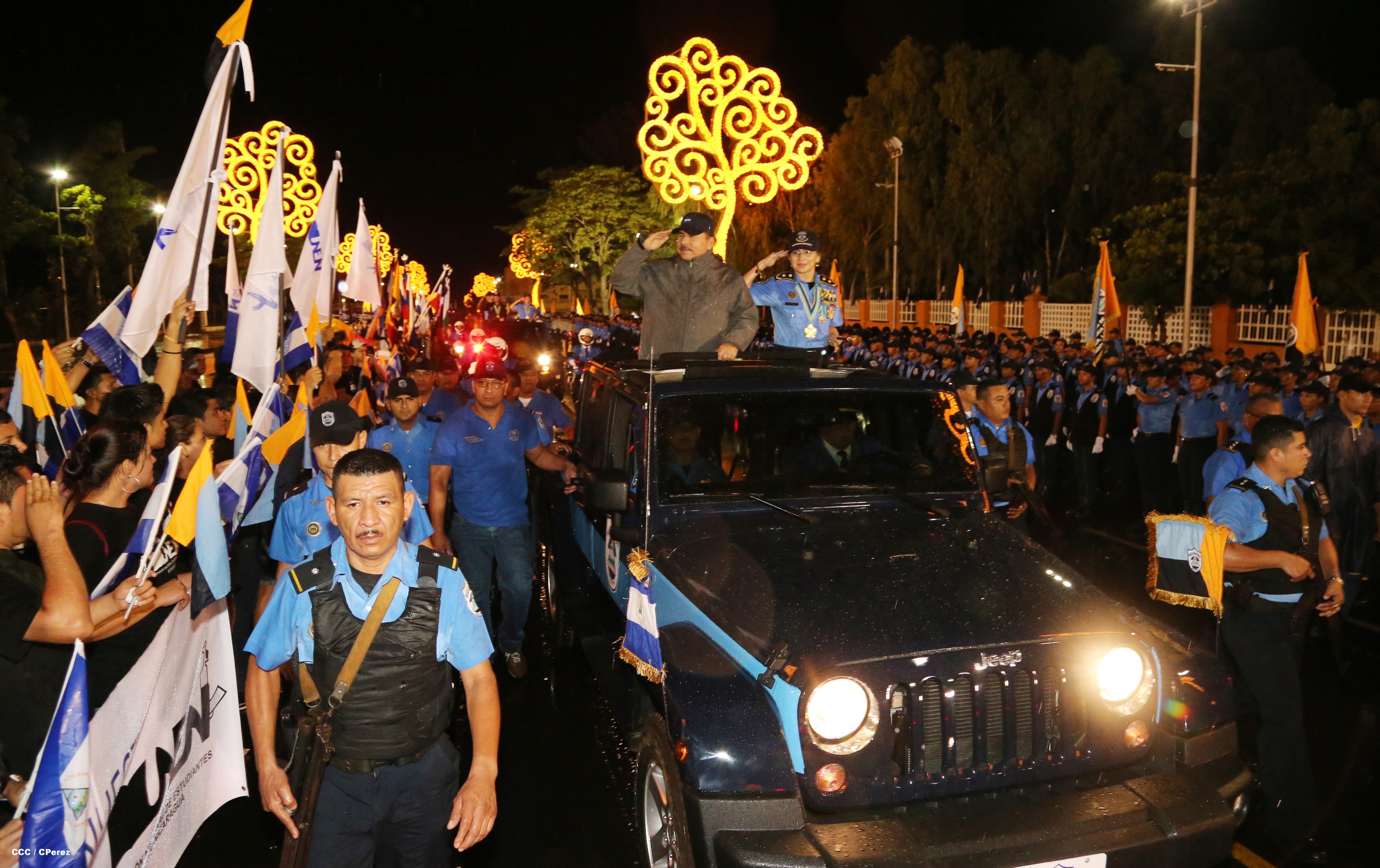 Desde la Avenida de Bolívar a Chávez, el Presidente de la República, Comandante Daniel Ortega Saavedra, presidió la noche de este jueves el desfile conmemorativo del 35 Aniversario de Fundación de la Policía Nacional, institución que atribuyó parte de los importantes logros que ha tenido en los últimos años Nicaragua en materia de paz y estabilidad.