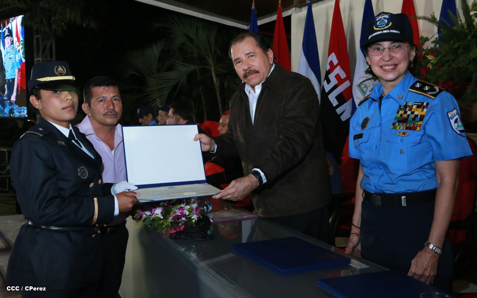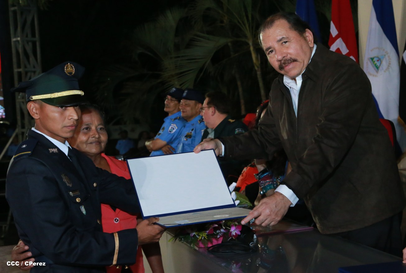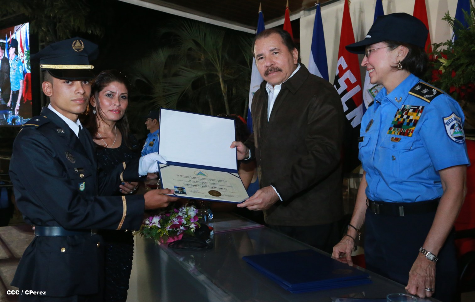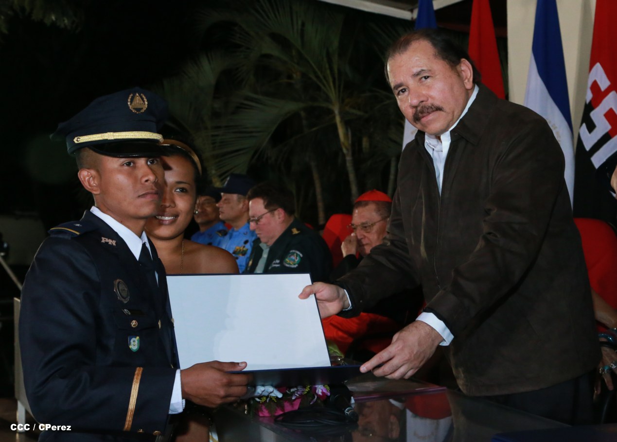 El Presidente de la República, Comandante Daniel Ortega, y la Coordinadora del Consejo de Comunicación y Ciudadanía, Compañera Rosario Murillo, presidieron este martes la XVII Promoción de Cadetes y Técnicos Medios de la Policía Nacional.