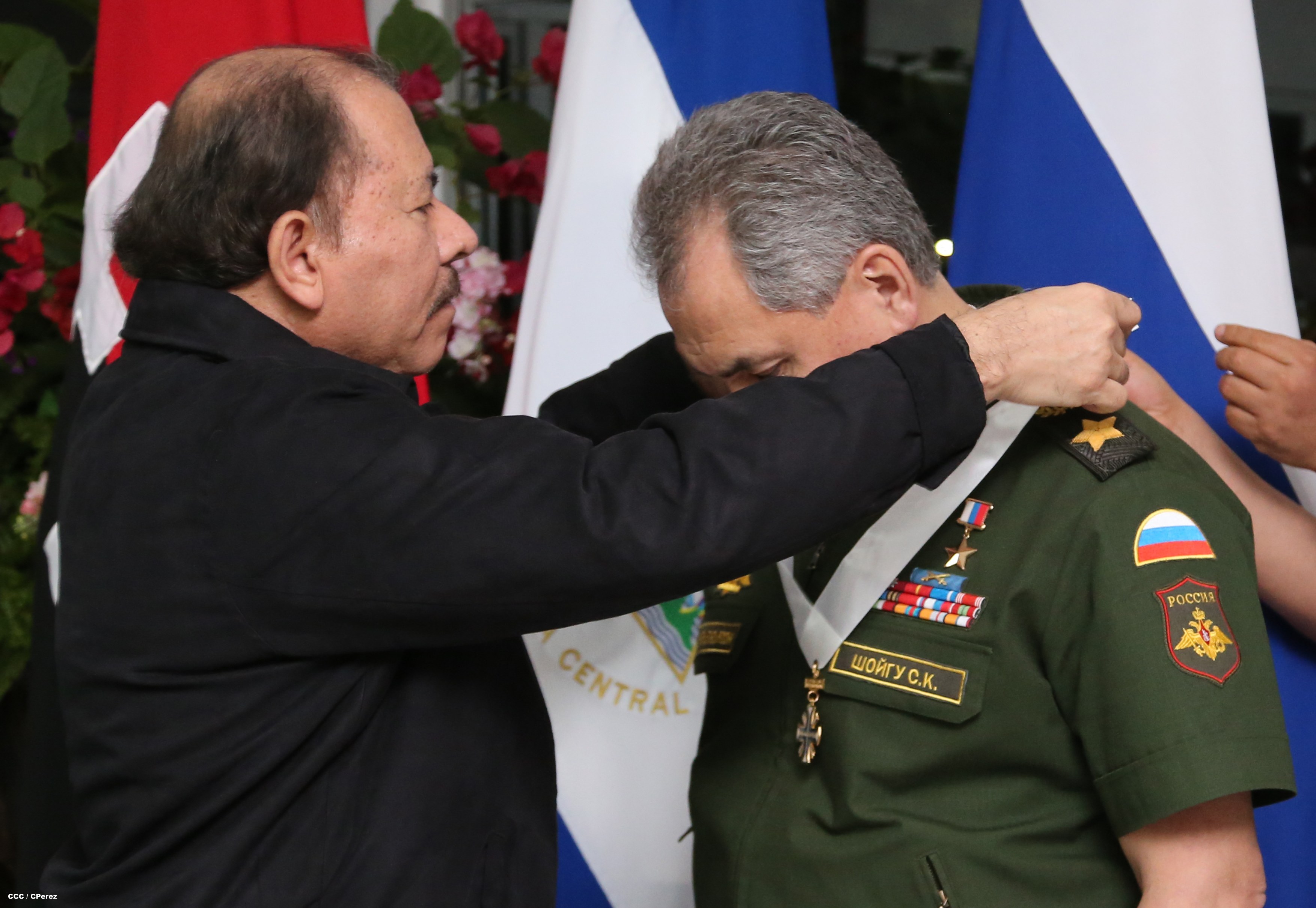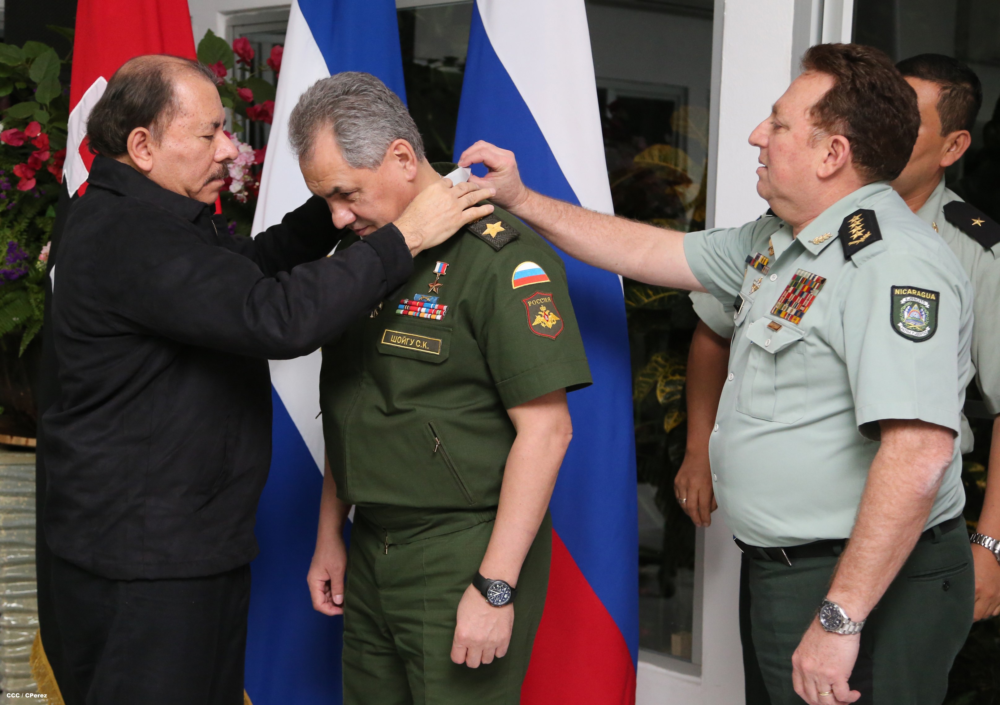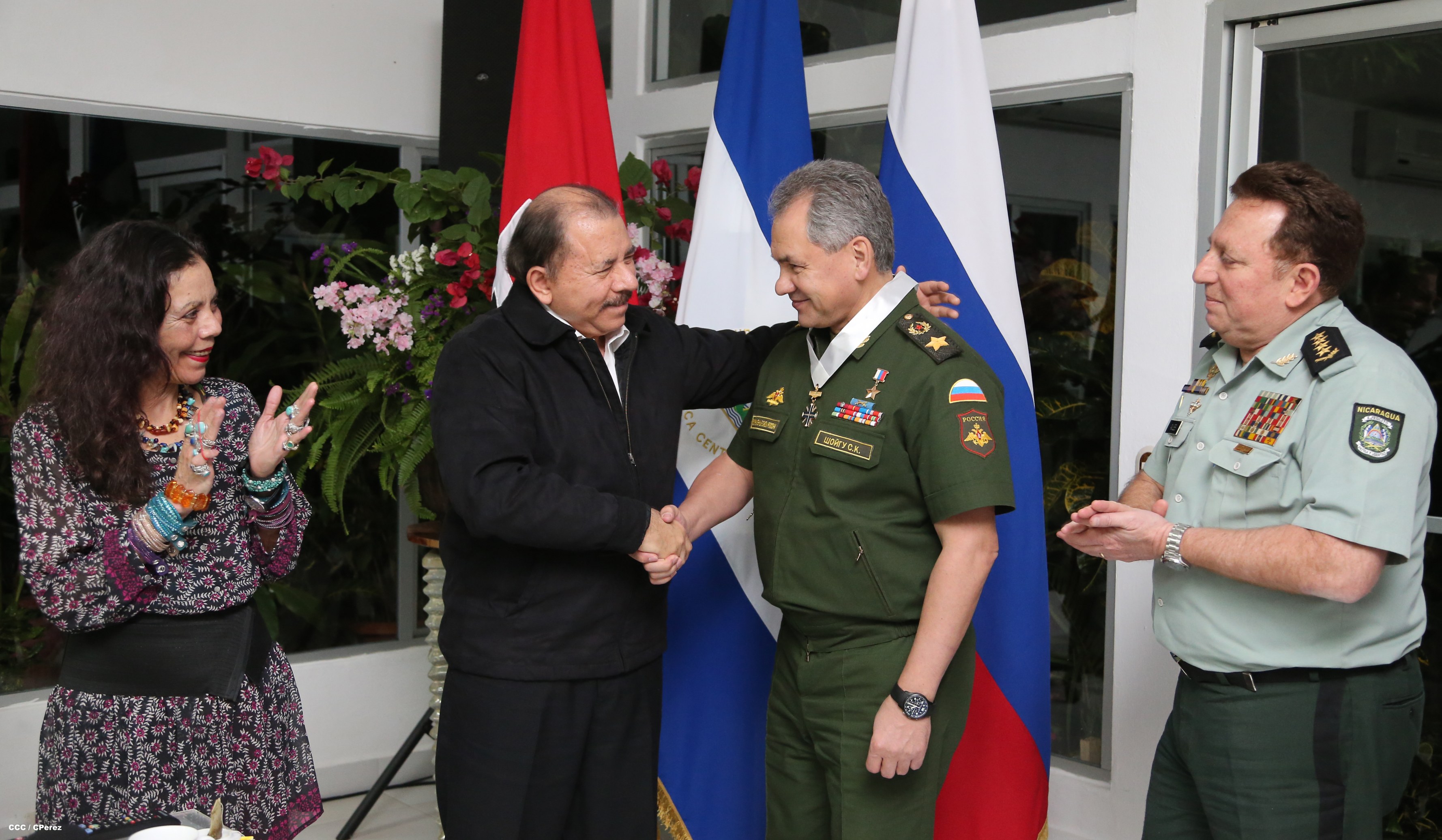 El Presidente de la República de Nicaragua, Comandante Daniel Ortega Saavedra, se reunió la noche de este jueves con el Ministro de Defensa de la Federación de Rusia, General Serguei Shoigu. En el encuentro participaron la Coordinadora del Consejo de Comunicación y Ciudadanía, Compañera Rosario Murillo; el Jefe del Ejército, Julio César Avilés, y miembros de la Comandancia del Ejército. Igualmente estuvieron presentes el viceministro de la Defensa de Rusia, Anatoly Antonov, y los demás integrantes de la delegación que visita nuestro país.