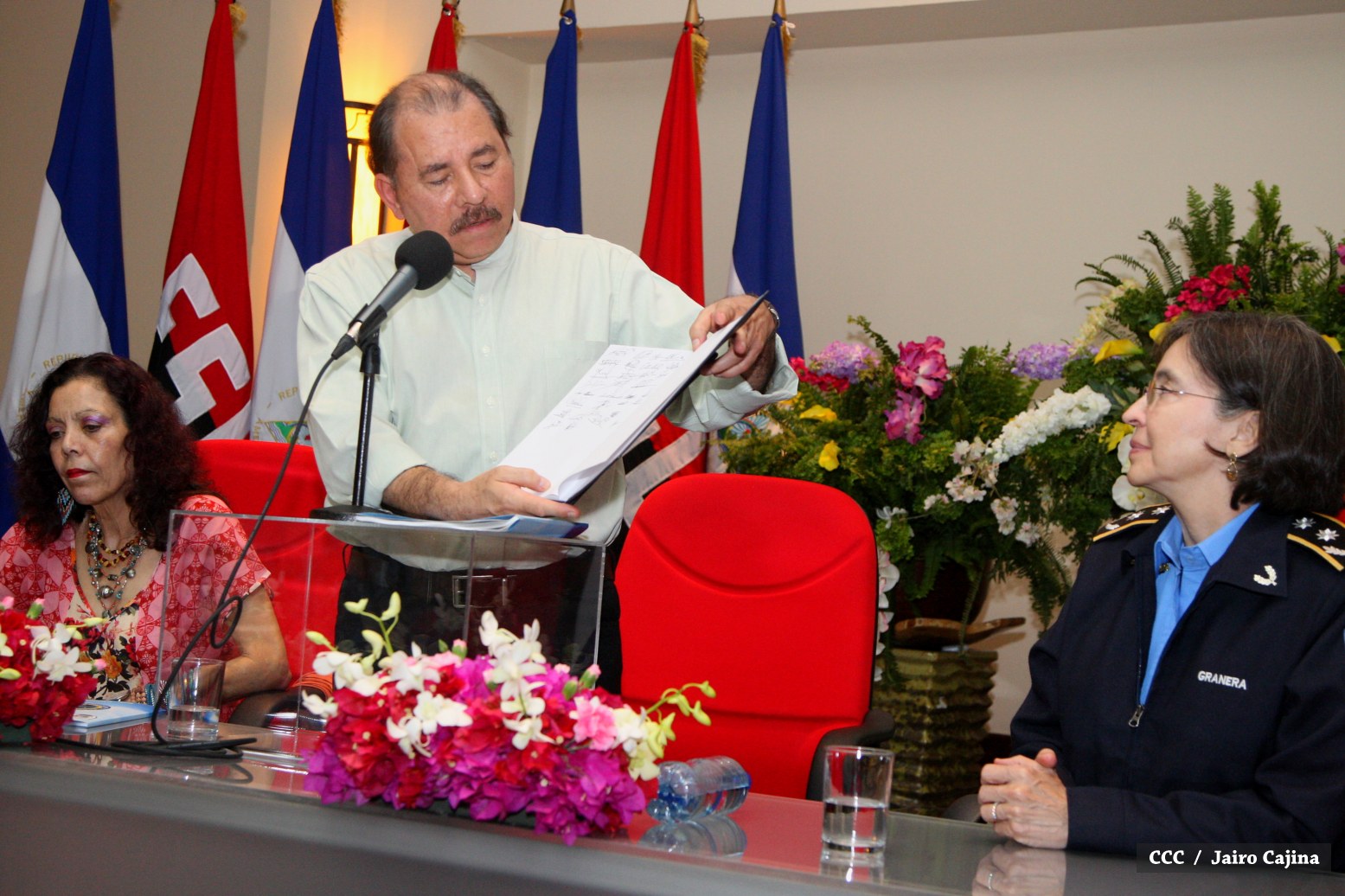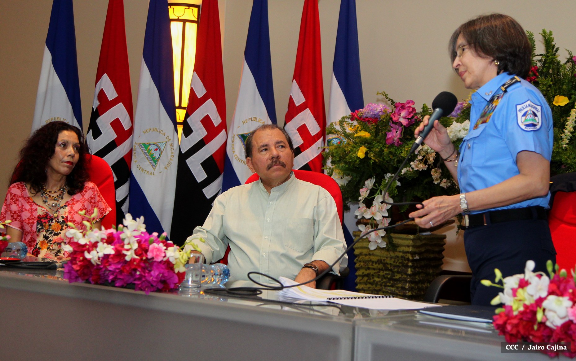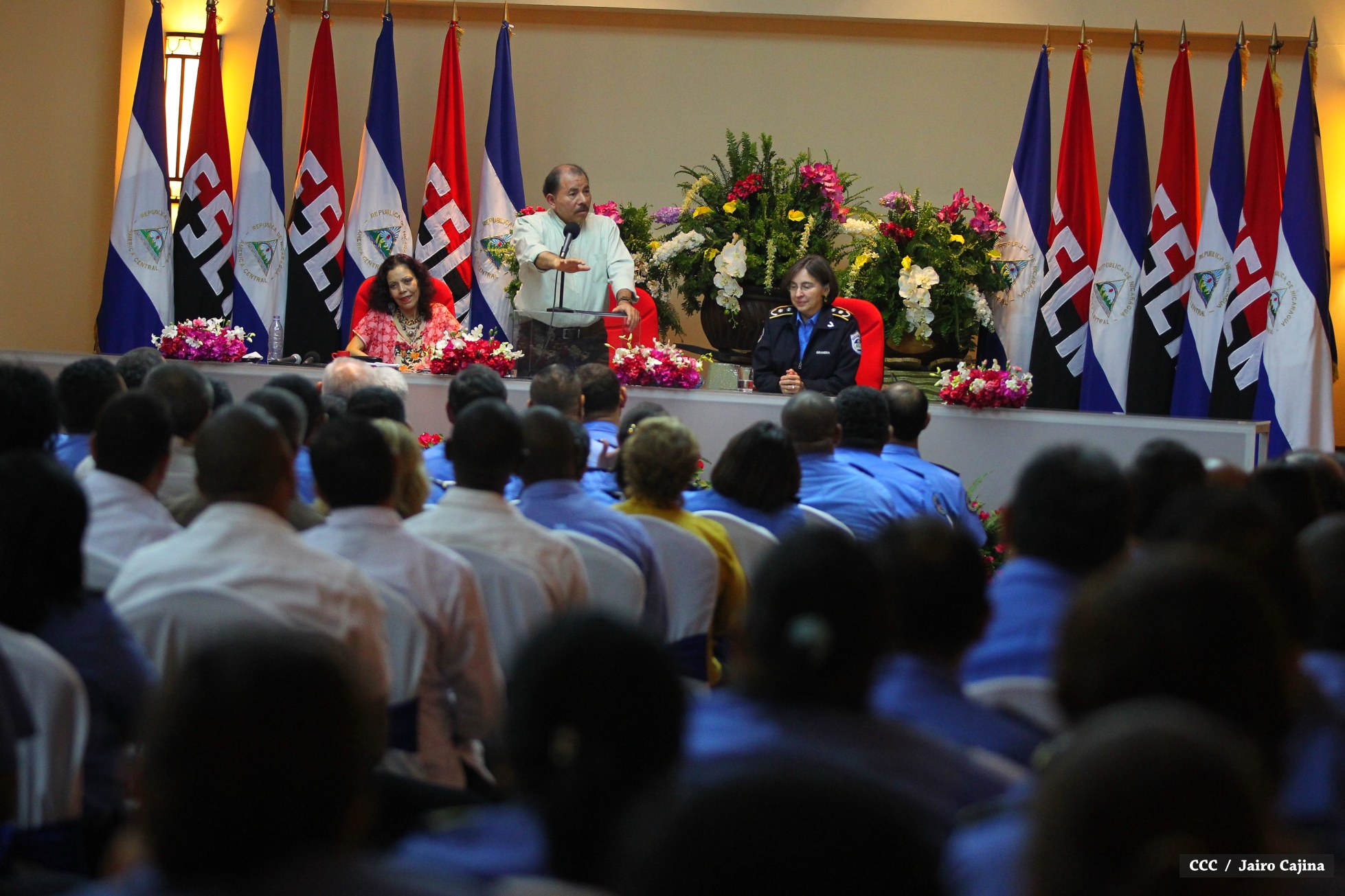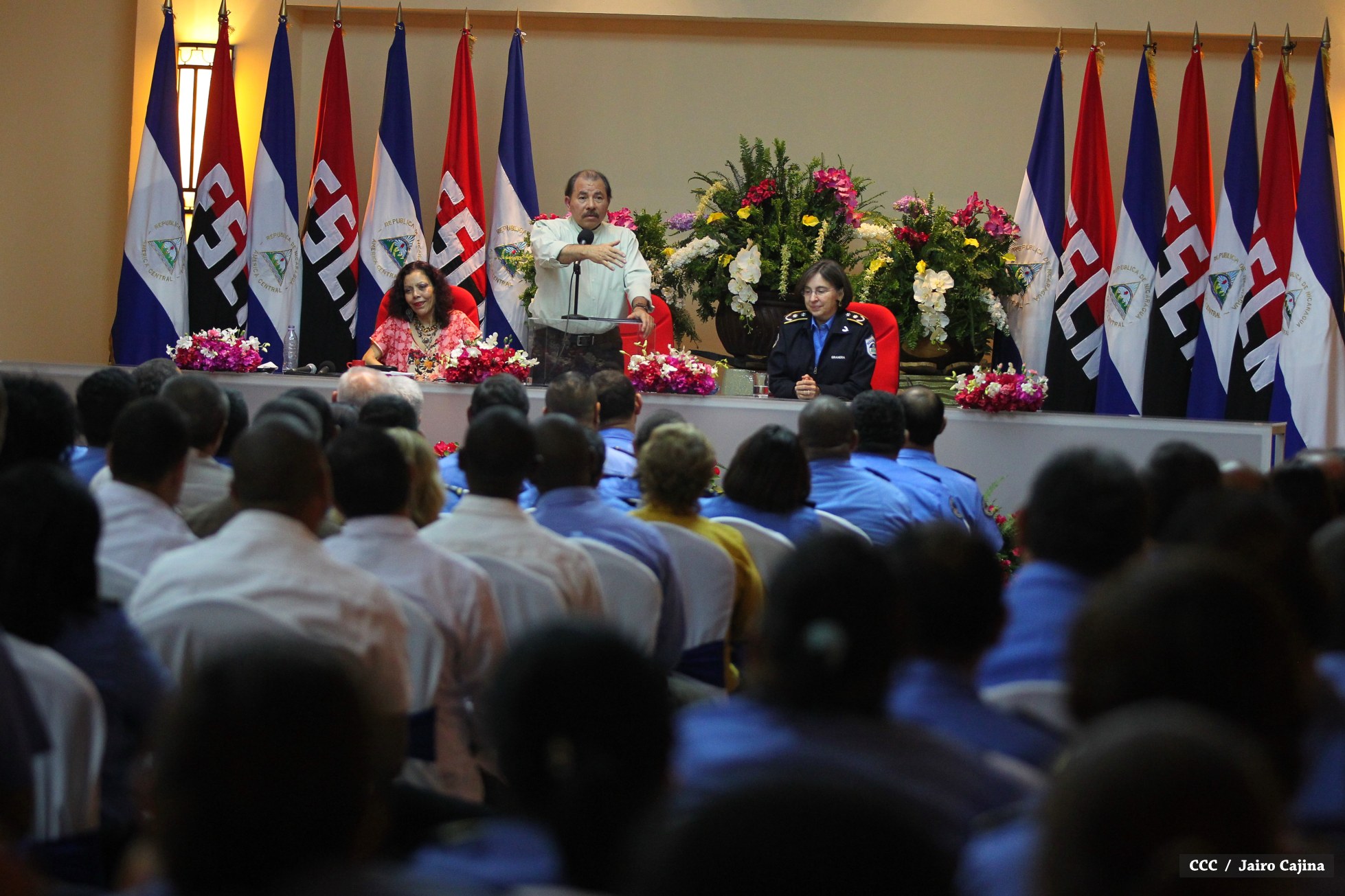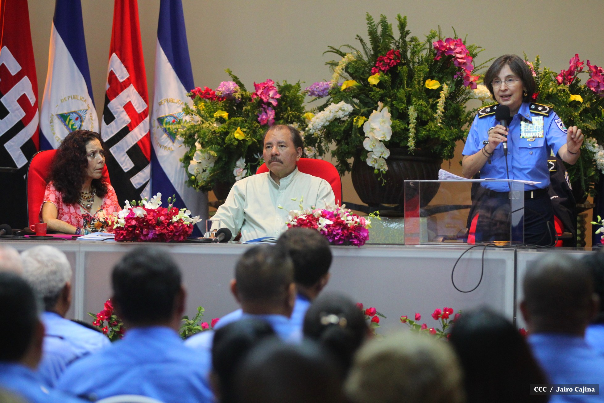El Presidente de la República, Comandante Daniel Ortega Saavedra, y la Coordinadora del Consejo de Comunicación y Ciudadanía, Compañera Rosario Murillo Zambrana, encabezaron este miércoles la XXIV Reunión de Mandos de la Policía Nacional, en donde les fue presentado el Plan de Fortalecimiento de la Seguridad Ciudadana y Humana que desarrolla la institución a lo largo del presente año.