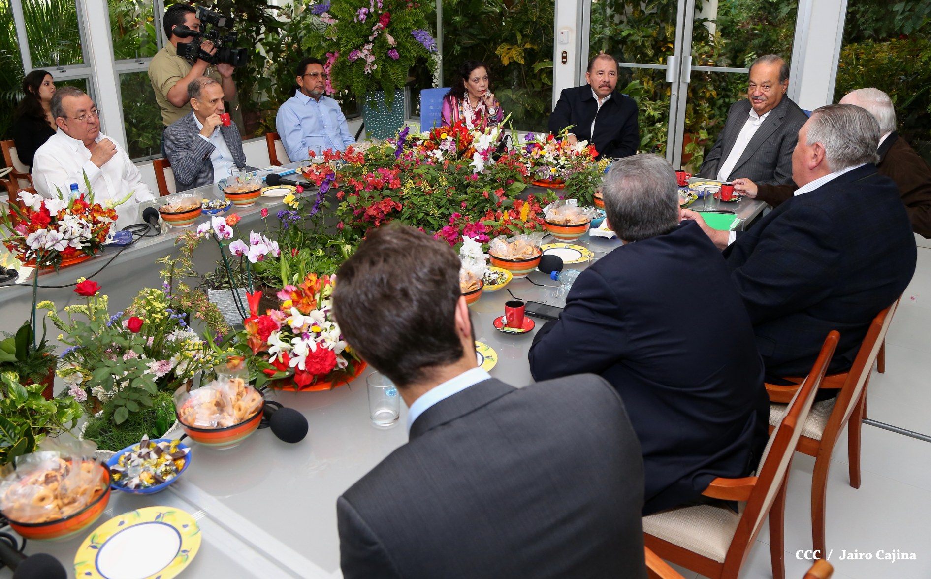 El Presidente de la República, Comandante Daniel Ortega Saavedra, y la Coordinadora del Consejo de Comunicación y Ciudadanía, Compañera Rosario Murillo Zambrana, sostienen este jueves un encuentro con el empresario mexicano, Carlos Slim.